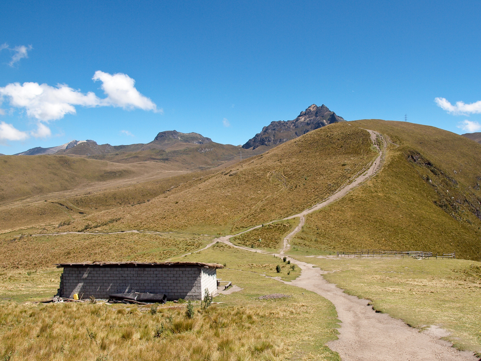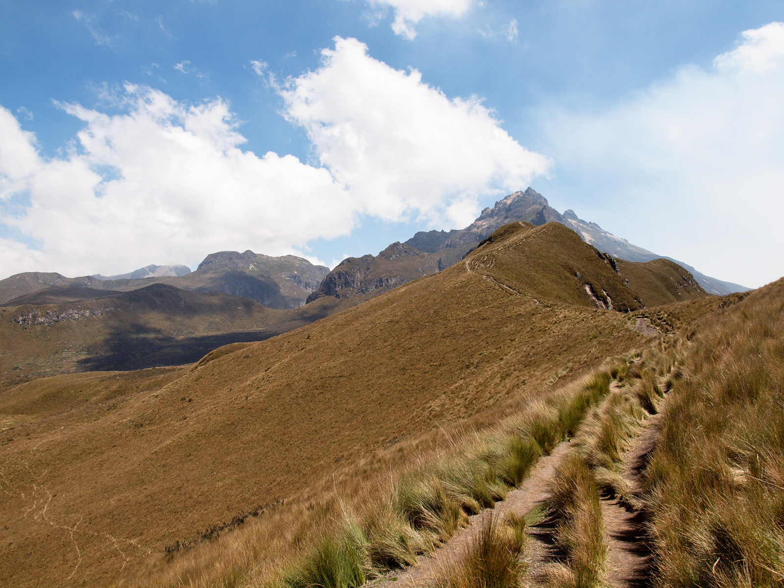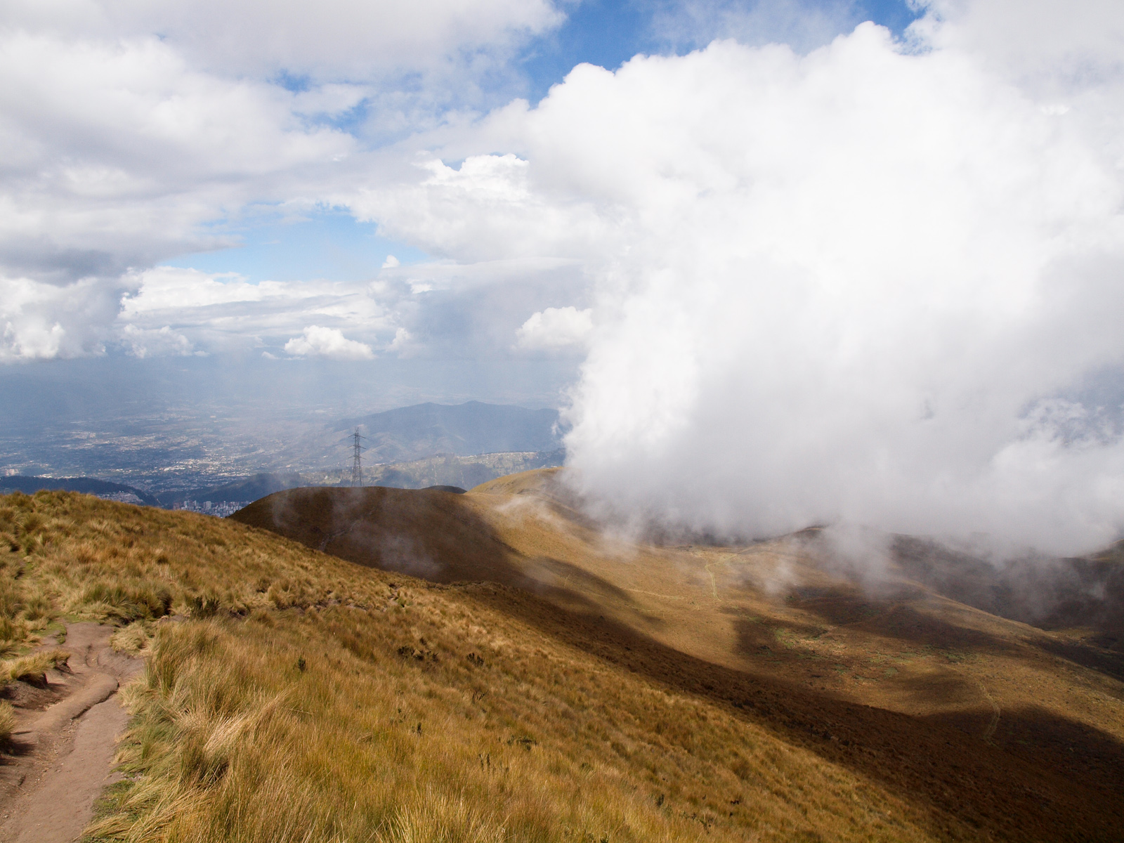 Sauf que… mĂŞme après 5 jours Ă Quito (environ 2800m), mon organisme n’est pas encore bien au point pour supporter l’altitude. Et puis c’est quand mĂŞme haut - pour donner une idĂ©e, la majoritĂ© des refuges pour monter le Mont Blanc sont en dessous de 4000m. Du coup, les premières minutes sont plus que difficiles, et j’ai l’impression que mes poumons vont exploser Ă chaque pas. Mais petit Ă petit je m’habitue, mes bras se mettent Ă balancer en cadence et je suis parti pour la montĂ©e. 100m, une photo, 100m, un gâteau sec, 100m, une gorgĂ©e d’eau, 100m, une petite pause pour reprendre mon souffle.