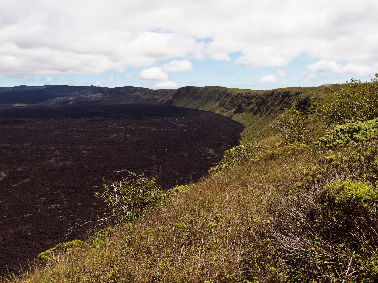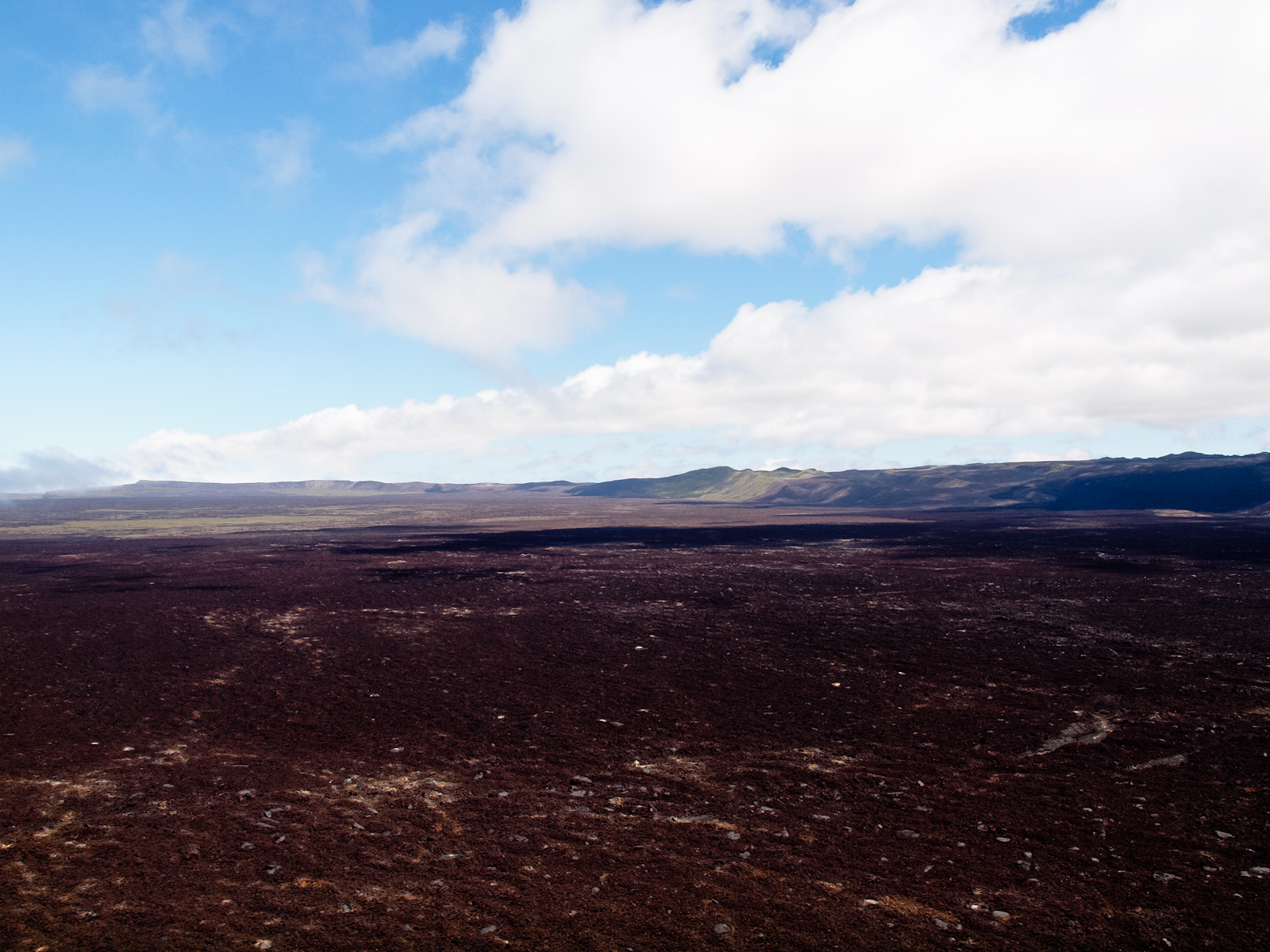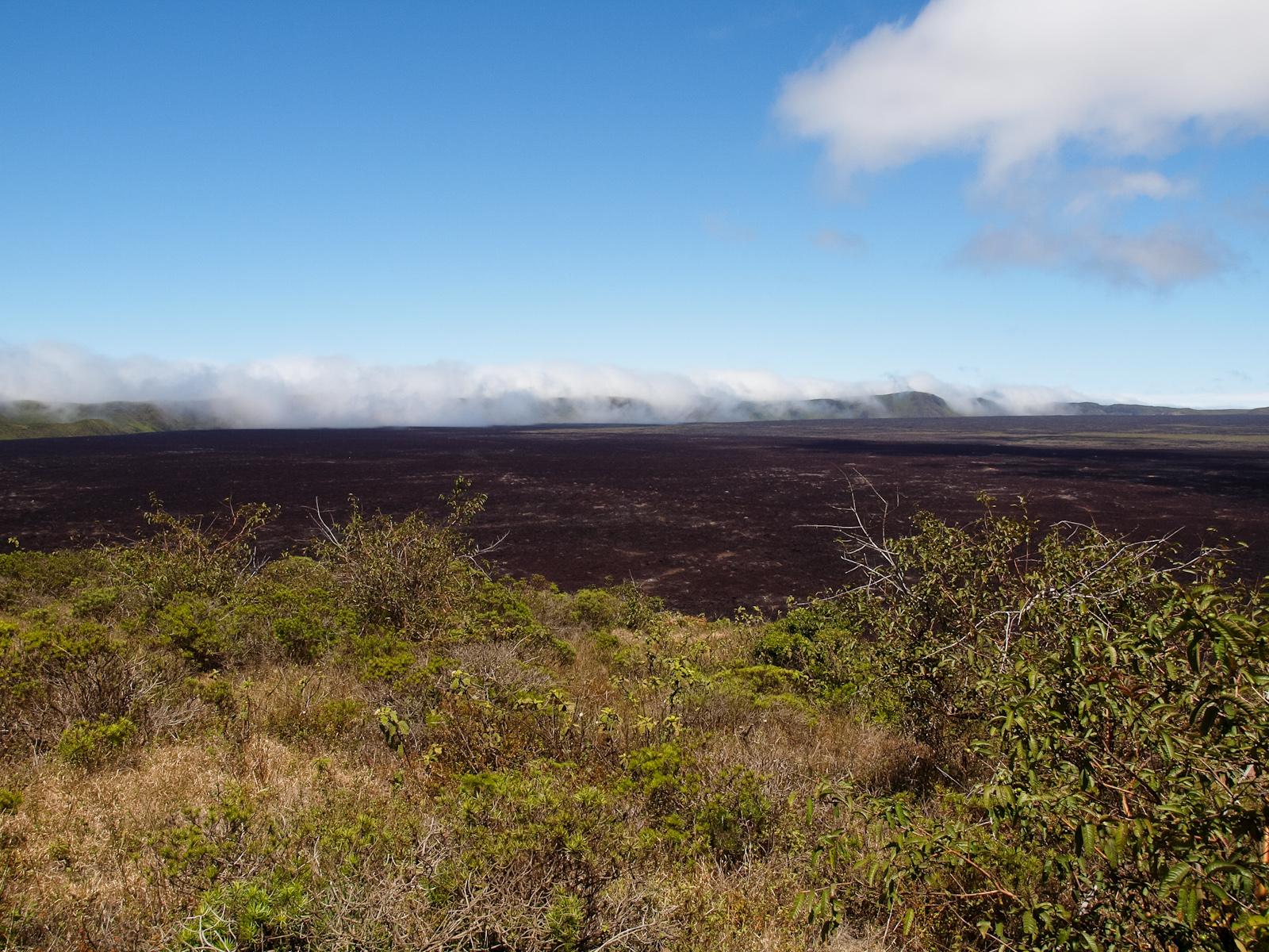 Alors en avant pour la suite, et cap sur le volcan Chico. Au fur et à mesure qu’on fait le tour, les nuages se lèvent et on peut bientôt commencer à apprécier le paysage, vraiment magnifique. Le cratère fait 12 kilomètres de large, et c’est de la lave à perte de vue, avec quelques nuages qui s’accrochent au rebord… Impressionnant.