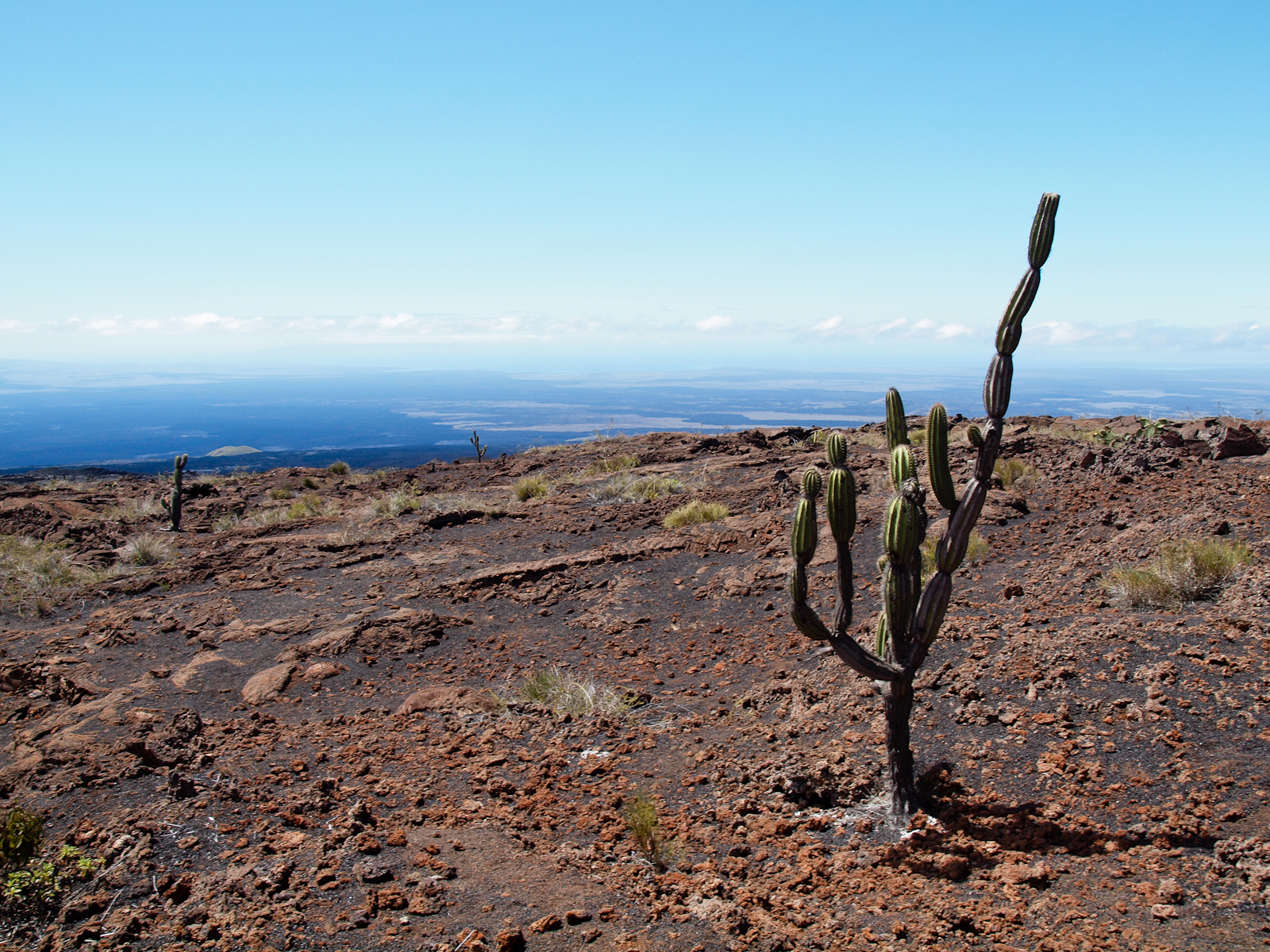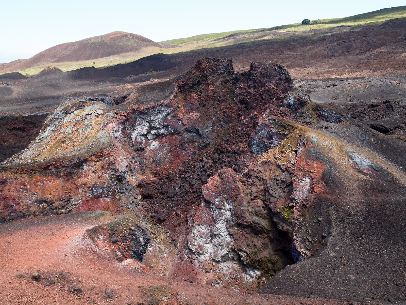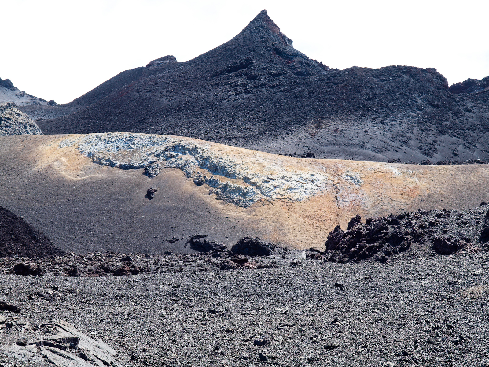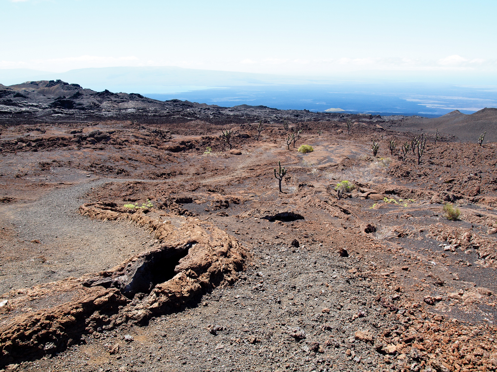 Après la pause pique-nique, on s’attaque au Chico proprement dit. C’est un cône parasite du Sierra Negra: la lave qui ne pouvait pas s’échapper par le cratère principal a trouvé un autre chemin pour sortir, et a créé un autre volcan à côté. Là, la vue est vraiment exceptionnelle: juste quelques cactus, des champs de lave, des tunnels de lave effondrés, des monticules de matière volcanique de toutes les couleurs à cause de l’érosion… La marche est difficile: sous un soleil de plomb, soit sur du sable très fin qui glisse, soit des cailloux qui roulent, ou de la lave qui coupe… Les trois litres d’eau par personne ne seront pas de trop mais ça valait vraiment le coup de se donner du mal!