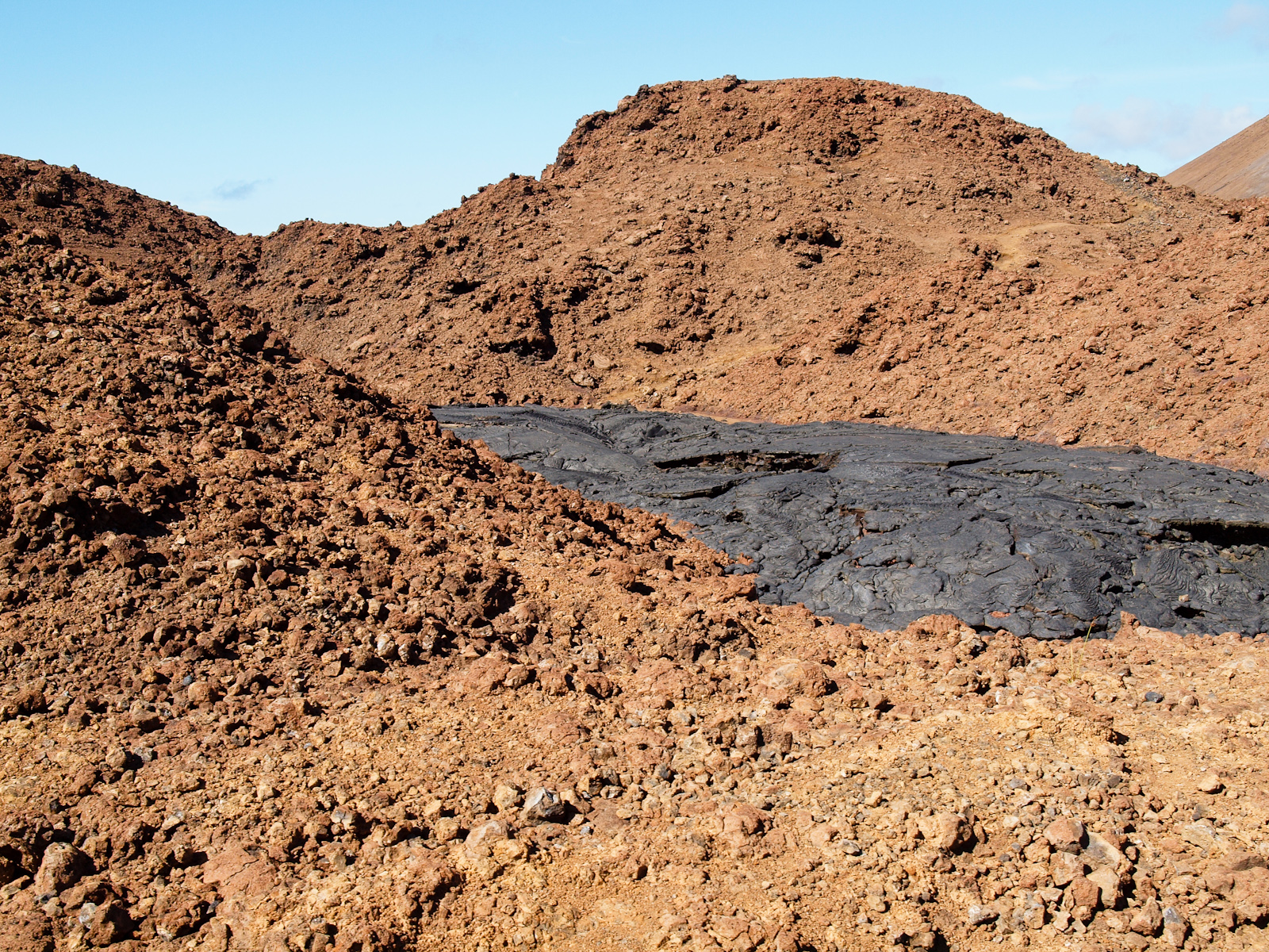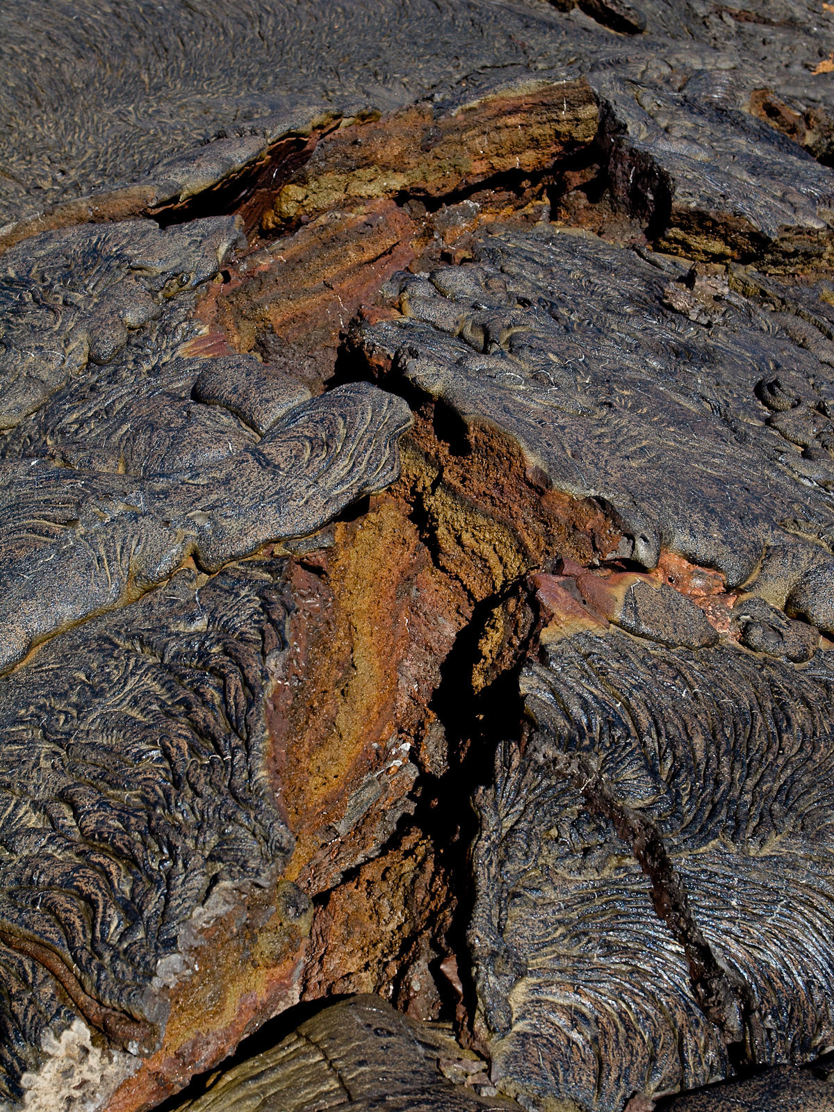 - et la lave pahoehoe, qui elle se solidifie sous forme de “coussins” ou de rides, et à la surface plate.