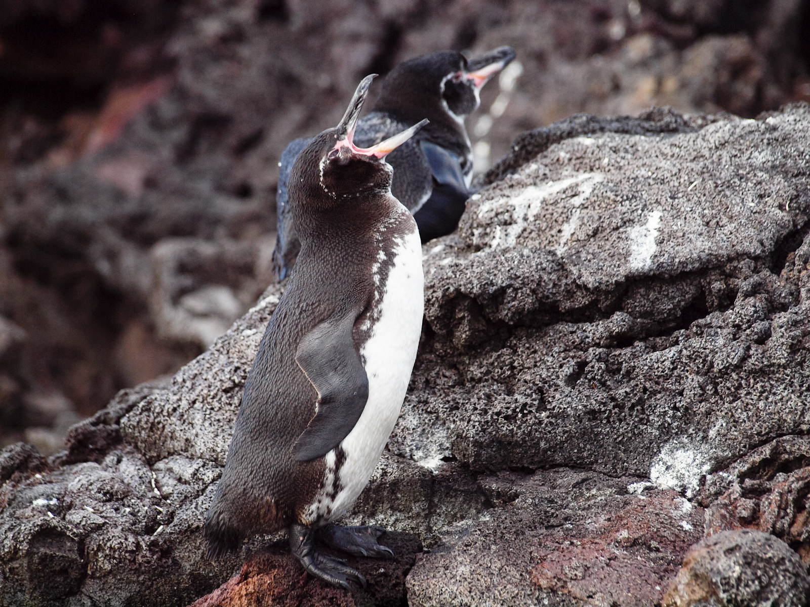 On retourne au bateau pour déjeuner pendant que le bateau navigue jusqu’à Bartolome, une toute petite île à l’ouest de Santiago aux paysages réputés “lunaires”. On doit débarquer en toute fin de journée sur l’île pour avoir un beau soleil couchant, donc on fait un peu de snorkeling histoire de passer le temps. Ce sera l’occasion de voir et de nager avec les manchots, qui vivent dans l’hémisphère Sud et ne volent pas (mais nagent très vite). À ne pas confondre avec les pingouins, qui eux vivent dans l’hémisphère Nord et peuvent voler (les ornithologues confirmés qui me lisent - je les sais nombreux - objecteront que les Galapagos sont à cheval sur l’Équateur, et que techniquement certains manchots qui y vivent sont donc dans l’hémisphère Nord, mais bon on va pas chipoter).