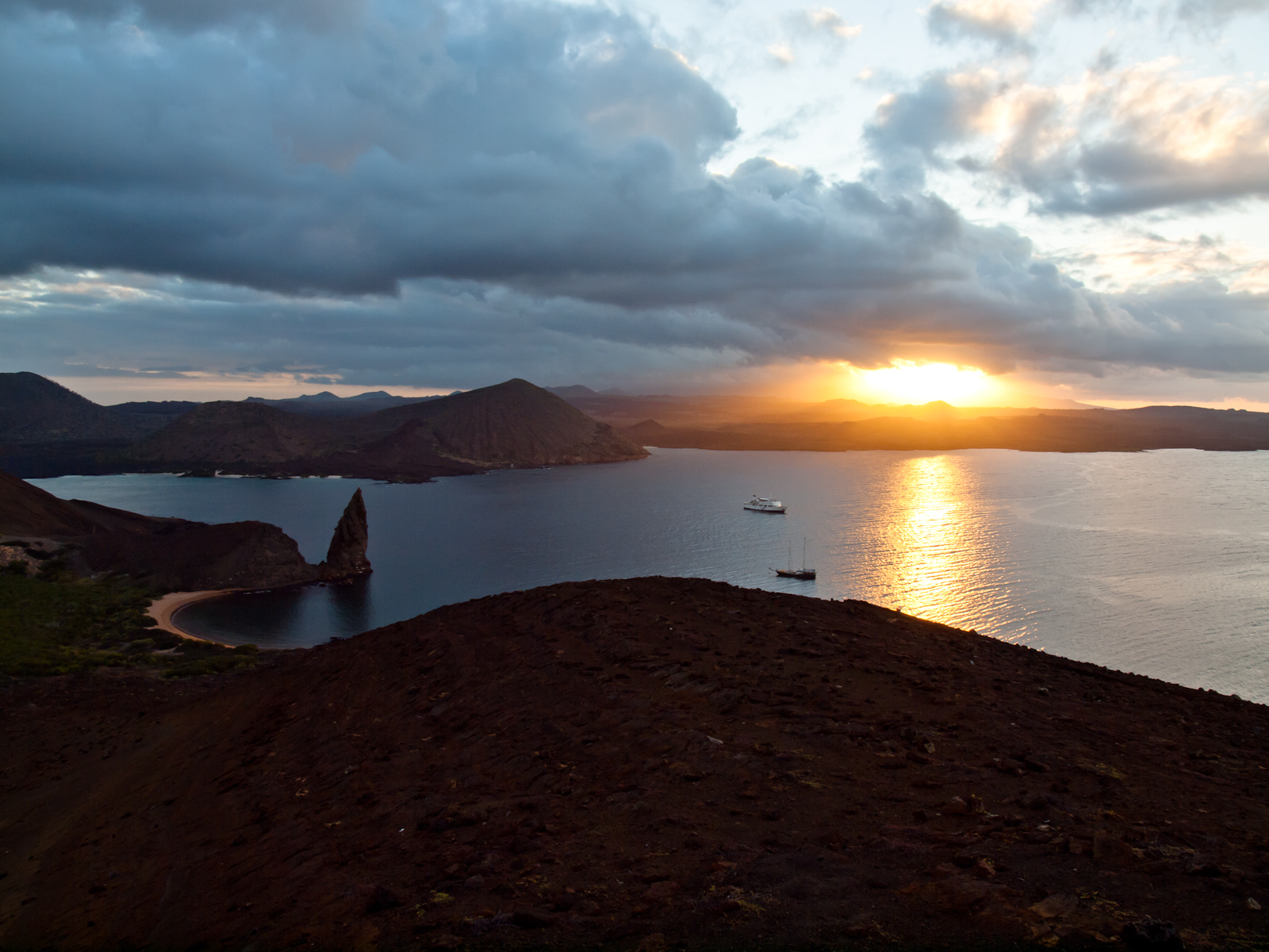 On débarque donc sur Bartolome, en passant à quelques mètres du fameux Pinnacle Rock , un rocher en forme de pic. L’île de Bartolome est très érodée, et le sol est entièrement constitué de poussière volcanique et est très fragile. Tellement que le parc national des Galapagos a construit un chemin surélevé en bois pour que les touristes puissent la visiter sans abîmer le site. On monte jusqu’au sommet en appréciant le paysage quasi-lunaire (j’ai jamais été mais je m’imagine), et une fois tout en haut on peut admirer le fameux rocher et les deux baies symétriques avec le coucher de soleil…