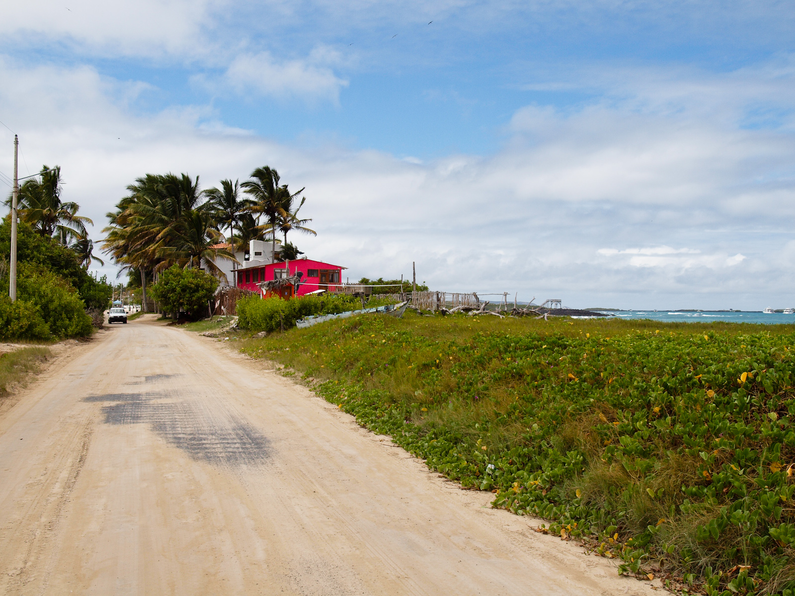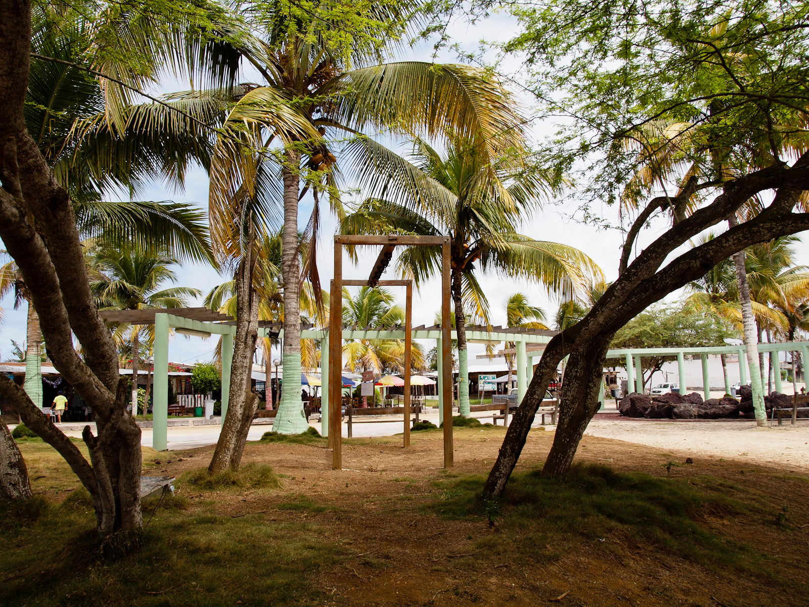 Je me suis donc pris un hôtel en peu en marge de Puerto Villamil, la principale “ville” d’Isabela. Je mets des guillemets parce qu’en fait, c’est une route en terre, une petite placette avec 5 bancs et autant de cocotiers, et tout autour des bars/restaurants, des locations de vélo et des hôtels.