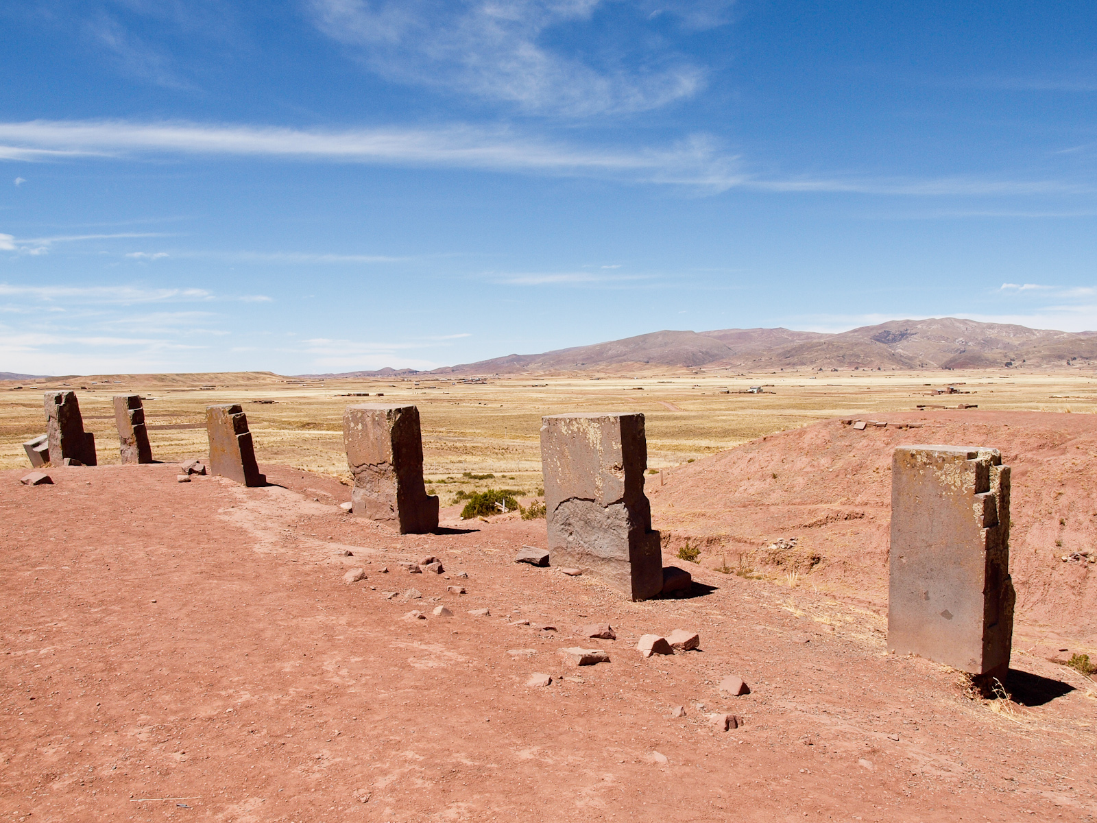 Tiwanaku est situé à environ 80kms de La Paz. C’est un ensemble de ruines, réputé être “un des plus grands sites archéologiques pré-incas d’Amérique du Sud”. Et bhé, ça promet! Pour commencer, il faut s’y rendre, au site. Ce qui implique environ 2h de voyage dans un minivan format bolivien. J’ai bien fait de choisir la banquette tout à l’arrière, comme ça il y a encore moins d’air que d’espace pour les jambes. Heureusement, en me faisant un torticolis j’arrive quand même à regarder par la fenêtre pour profiter de la vue sur l’altiplano…