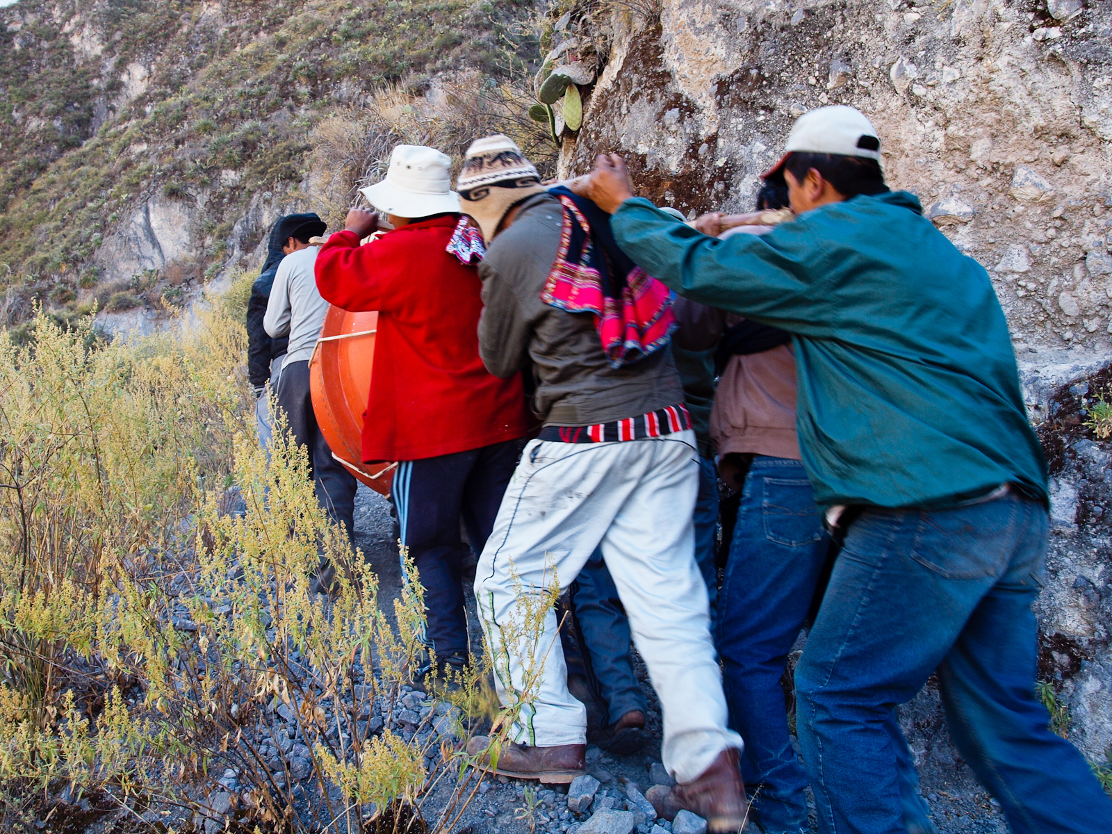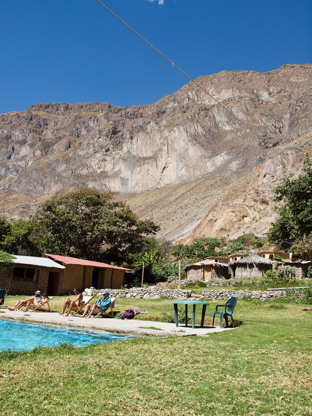 Idéal pour se reposer un peu. Un plongeon et un autre steak d’alpaca plus tard, je repars pour la longue montée pour rentrer sur Cabanaconde. Je suis parti vers 15h pour ne pas avoir trop chaud, mais c’est quand même 1000m de dénivelé et les jambes commencent à tirer… J’arrive à Cabanaconde juste à la tombée de la nuit.
