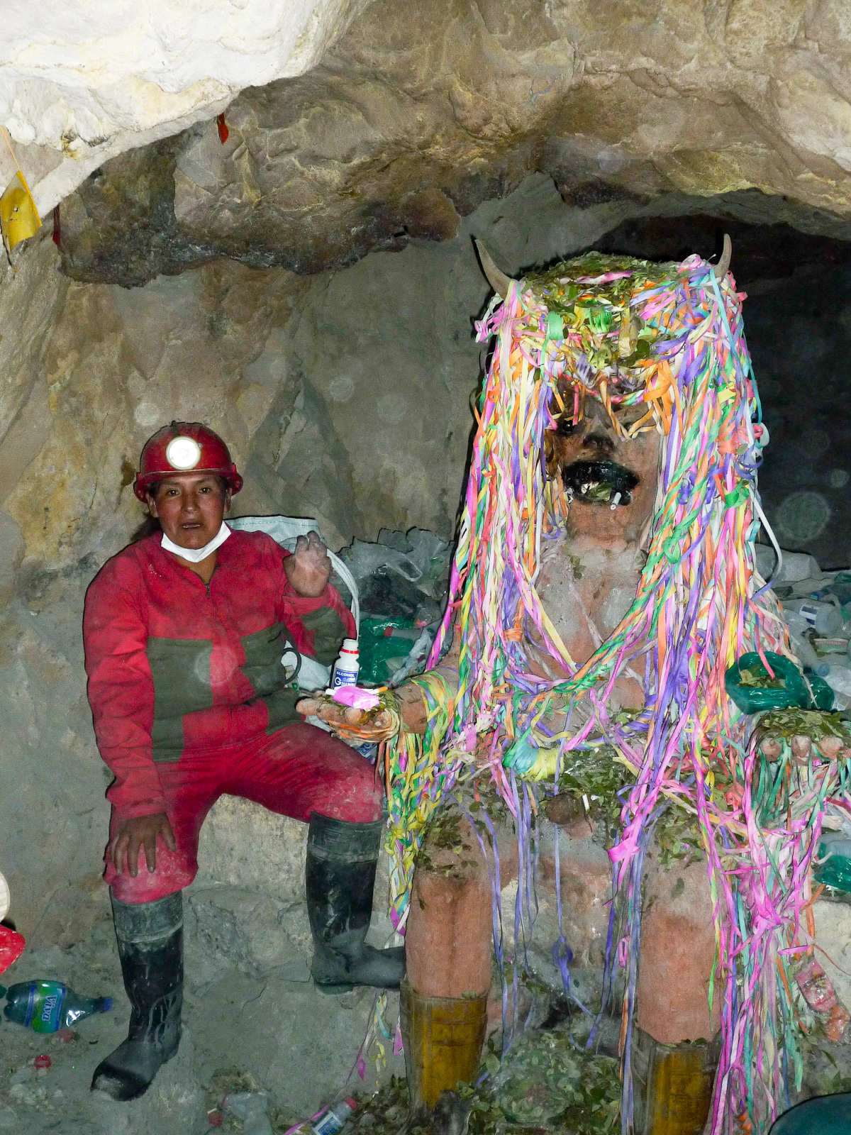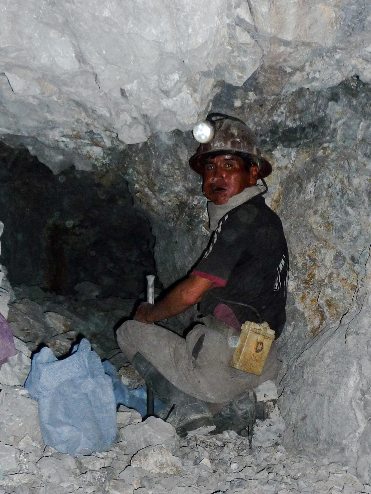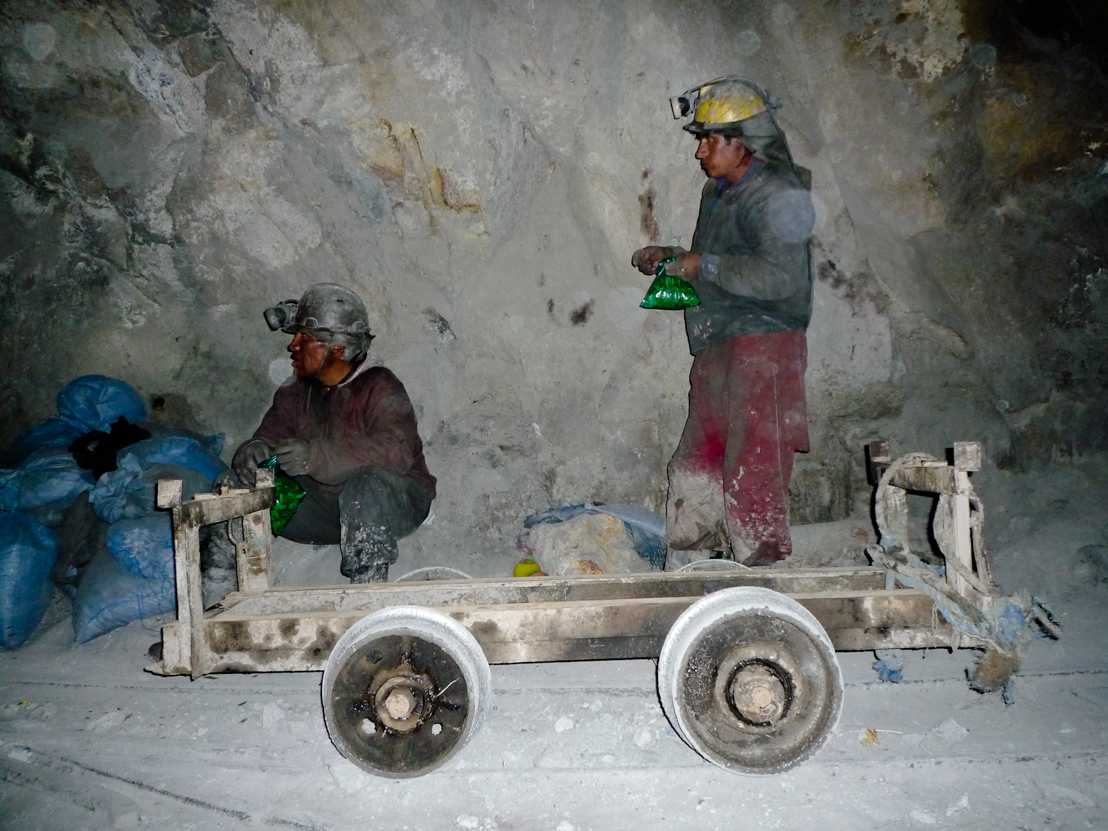 À l’intérieur de la mine, ça patauge dans la gadoue, il faut marcher à 4 pattes dans les tunnels, il y a plein de poussière qui pique les yeux et la gorge, et au bout de quelques minutes ma salive a un drôle de goût de métal. Les travailleurs de la mine ont apparemment une espérance de vie de 15 ans à partir du moment où ils y rentrent (problèmes respiratoires et silicosis). La mine est une coopérative, donc chaque mineur exploite son propre filon pour son compte (moyennant une taxe payée au gouvernement), et emploie des assistants dynamiteurs et des pousseurs de chariots. C’était la fête de la coopérative les deux derniers jours, donc les travailleurs ne sont pas très nombreux à l’intérieur. On rencontrera surtout des pousseurs de chariot, et un mineur qui fera mentir les statistiques - puisqu’il y est rentré à 14 ans et en a maintenant 42. À l’intérieur, les travailleurs sont intéressés par deux choses: d’abord, boire quelque chose et ensuite, savoir quelle heure il est (vu qu’ils n’ont pas de montre et ne voient pas la lumière du jour). La plupart de ceux que nous rencontrerons ont commencé leur “service” vers 3 ou 4 heures du matin.