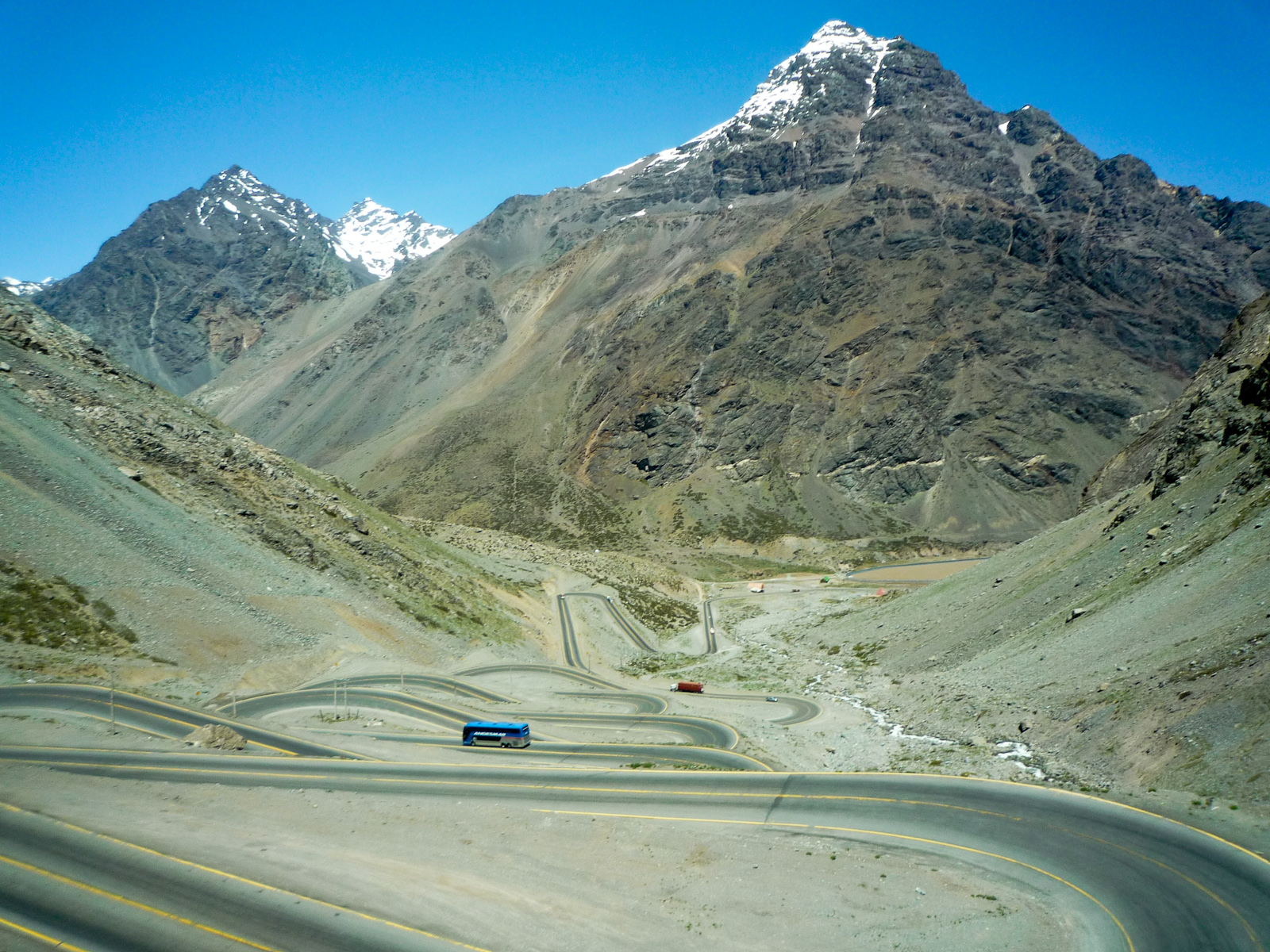 Santiago est située au pied des Andes, et le trajet en bus depuis l’Argentine est très scénique: passage de frontière au milieu de la neige à plus de 3500m d’altitude, avant une longue descente en épingle pour finalement arriver dans la capitale du Chili!