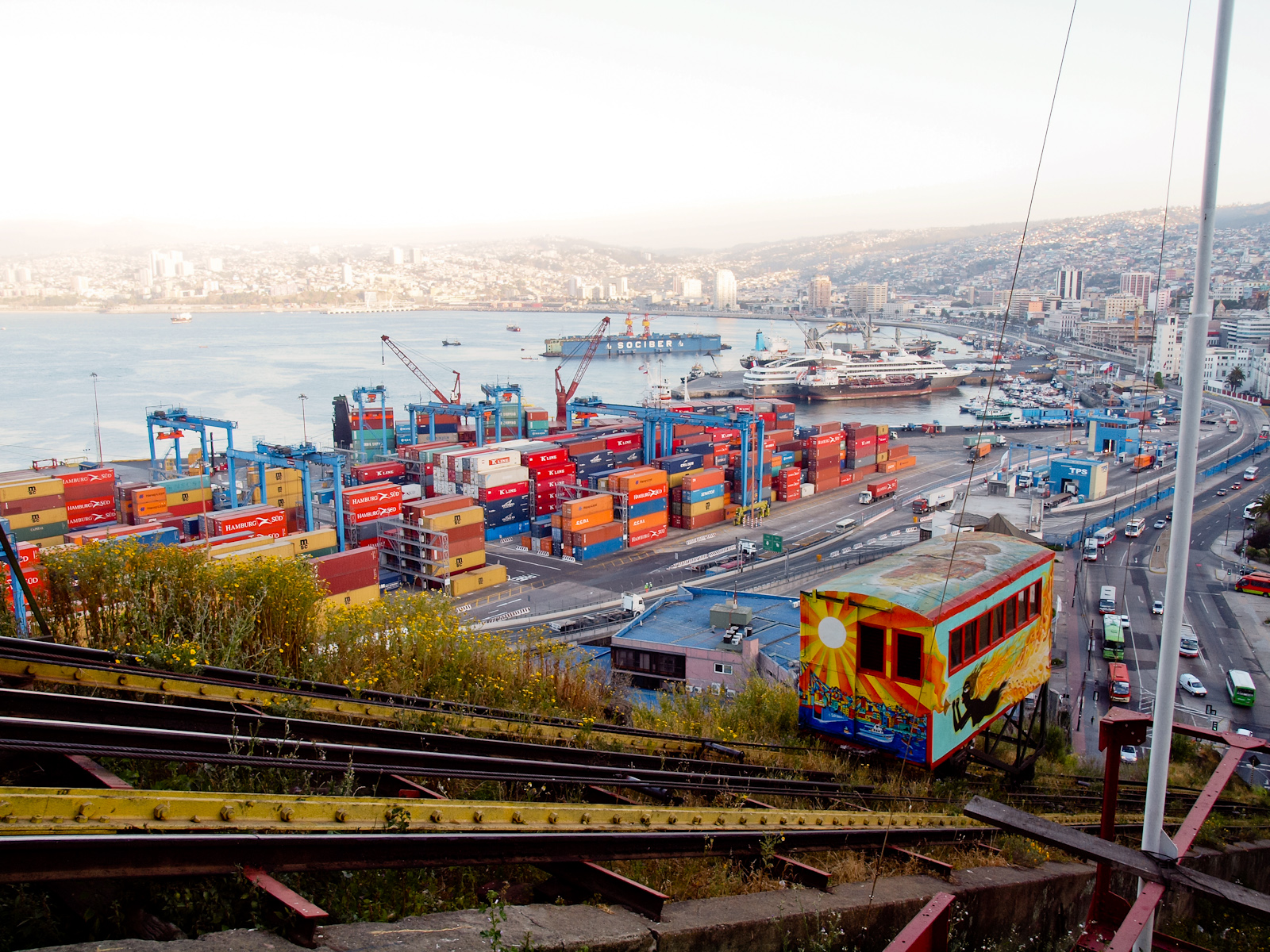 Une des grandes attractions de Valparaíso, ce sont bien sûr les funiculaires. Installés pour éviter aux habitants de monter et descendre les collines plusieurs fois par jour. Un bon tiers est hors-service, mais je crois bien qu’on a utilisé tous ceux qui marchaient :) Le port de marchandises est encore très actif. Bien évidemment, je suis resté pendant plusieurs dizaines de minutes à observer rêveusement le ballet des containers, aussi multicolores que les maisons.