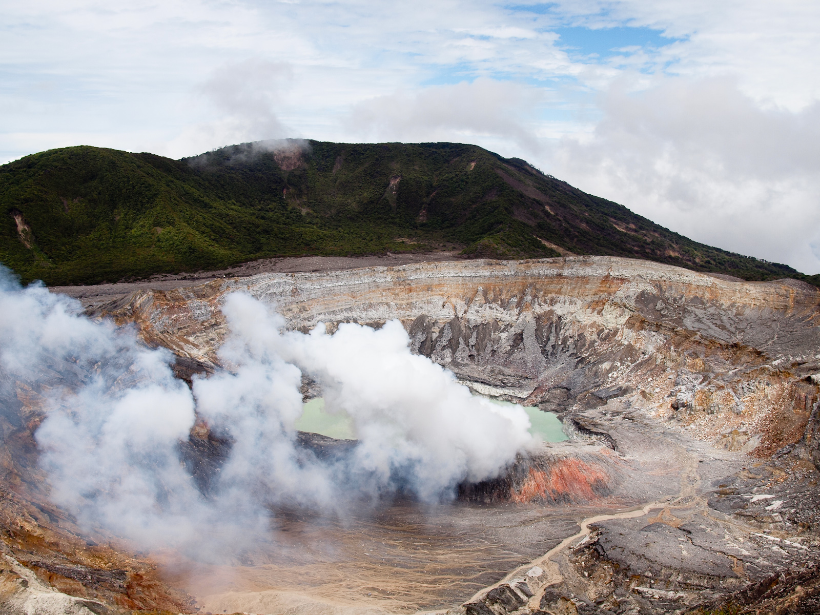 Je découvre la vision du tourisme à la sauce costa-ricaine, qui me rappelle certaines mauvais souvenirs du Pérou ou de l’Argentine: les prix d’entrée dans les parcs ou les sites sont le triple ou le quadruple du prix pour les locaux (qui de toute façon carottent quand ils le peuvent pour ne pas payer). La monnaie de fait est le dollar, ce qui fait que quand on paye avec la monnaie locale il faut faire la conversion au taux de change du jour. C’est un peu comme si on disait que l’entrée du Louvre est à 15$ et que si tu veux payer en euros faut sortir la calculette pour savoir combien ça fait. Plutôt bizarre… Malgré tout la vue est quand même sympa: le cratère s’est rempli d’un lac avec une chouette couleur verte, et il y a une fumerolle qui dégage des émanations soufrées en permanence.