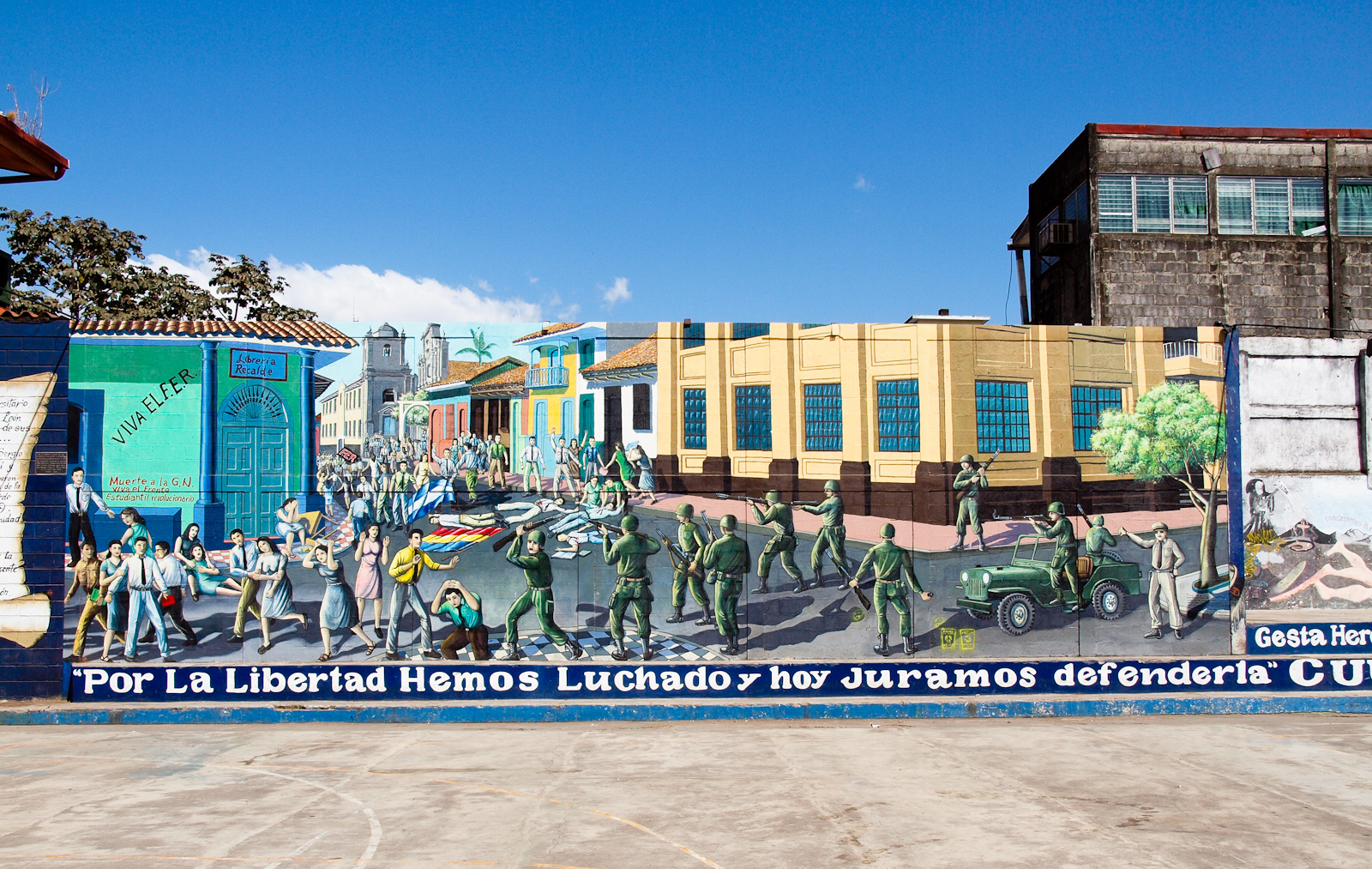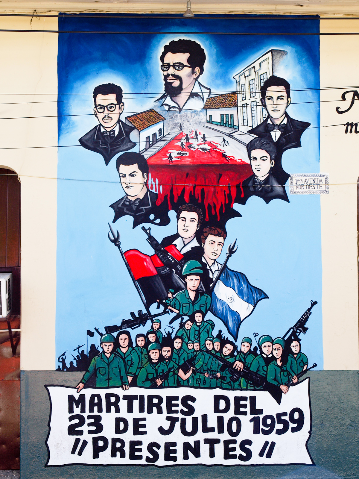 León est une ville importante dans l’histoire du Nicaragua. Ville très étudiante, ce fut aussi un des foyers de la révolution qui a embrasé le pays à la fin des années 70. Petit résumé des évènements: en 1934, le libéral Sandino est assassiné par le conservateur Somoza García, ce qui permet à ce dernier de s’installer au pouvoir en tant que dictateur à vie. En 1956, Somoza García est à son tour assassiné lors d’une réception officielle à León par un journaliste déguisé en serveur. La famille Somoza prend le relais, jusque dans les années 70, où les sandinistes (du nom du rebelle Sandino) finissent par reprendre le pouvoir après plusieurs années de “révolution”. De nombreuses fresques murales rappellent le rôle qu’a joué León durant cette période.