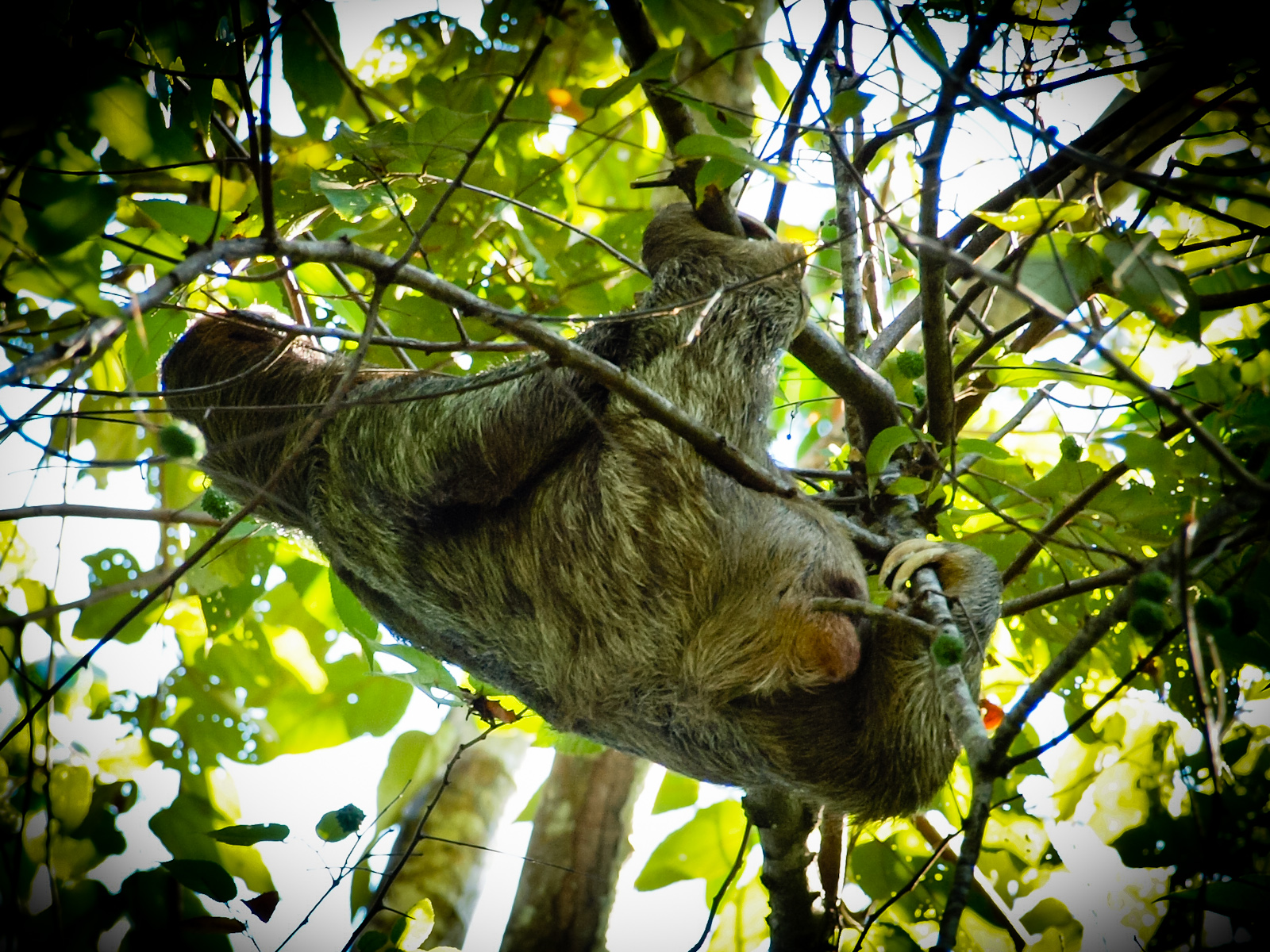 La chaleur est vraiment incroyable - il y a quelques chemins de rando (malheureusement les plus sympa sont “fermés pour rénovation”, bouh) et je me liquéfie sur place en marchant dans la jungle en plein cagnard. J’ai quand même vu des paresseux, que je voulais voir en vrai depuis un moment, beaucoup d’oiseaux, des coatis qui mangent du papier-toilette (ça ressemble un peu à un raton-laveur), pas mal de papillons, des grenouilles, des iguanes, et aussi la fameuse vipère fer-de-lance, une des espèces les plus dangereuses d’Amérique Centrale.