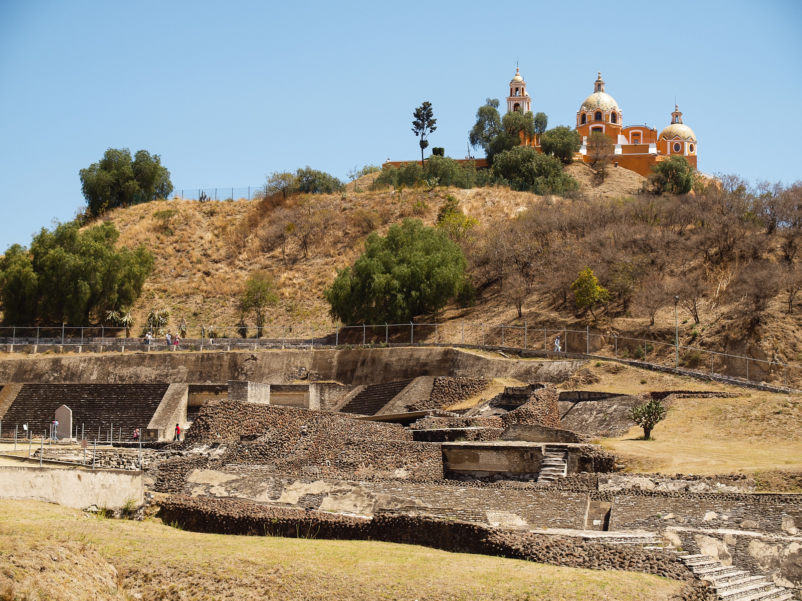 À côté de Puebla il y a aussi un petit village (avec plein d’églises, pour changer) qui s’appelle Cholula. Le village en tant que tel n’est pas franchement passionnant mais on y vient surtout pour la Grande Pyramide de San Pedro Cholula (avec les majuscules sinon ça fait moins classe). C’est quand même le plus grand temple-pyramide du continent - et elle est même plus grande que la pyramide de Gizeh en Égypte (au moins en volume), donc ça mérite d’être un peu expliqué… Les locaux ont construit le temple en construisant pyramide sur pyramide jusqu’à ce que ce soit bien immense. Ensuite ils se sont barrés parce qu’ils avaient des trucs à faire ailleurs, en laissant le machin en plan - et en le baptisant du doux nom de Tlachihualtepetl en langue locale (ce qui veut dire la montagne artificielle). Le temps a passé, l’herbe a poussé sur la pyramide au point de la recouvrir de végétation et là, les Espagnols sont arrivés. Bien décidés à convertir tout le monde au catholicisme, ils se sont dit que mettre une église en haut de cette belle grosse montagne serait du plus bel effet - sans soupçonner le moindre instant qu’il y avait un temple en dessous. Après, les scientifiques se sont rendus compte du truc, ont commencé à raconter l’histoire et ensuite les cars de japonais sont arrivés.