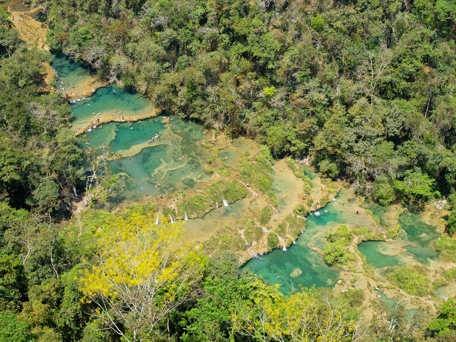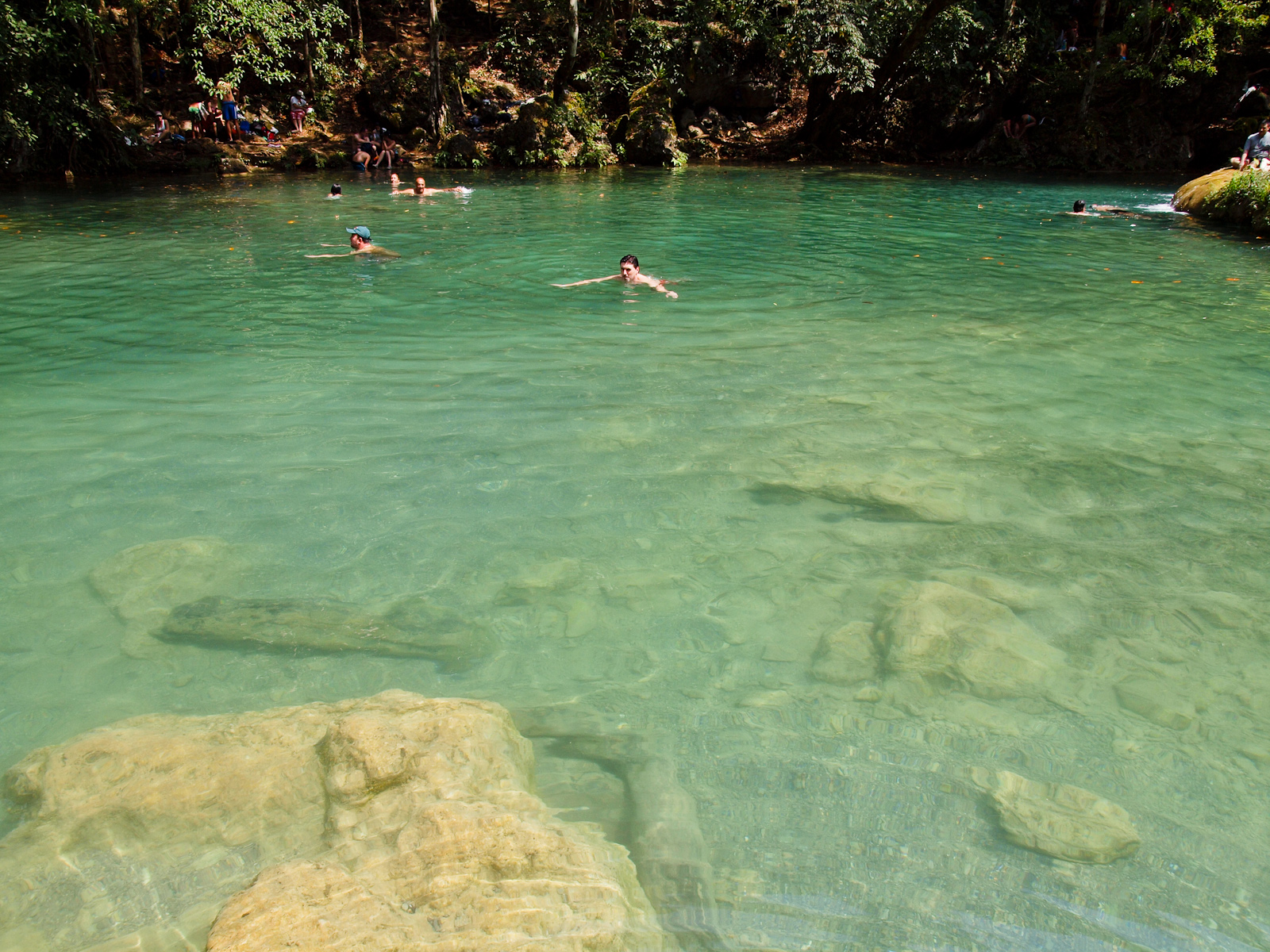 Et finalement, on se lance à la découverte des bassins de Semuc Champey, c’est quand même pour ça qu’on est venus. C’est une série de bassins/cascades qui se trouve à un endroit bien particulier: une rivière passe sous un pont rocher calcaire, coule sous terre pendant plusieurs centaines de mètres avant de ressortir de l’autre côté…