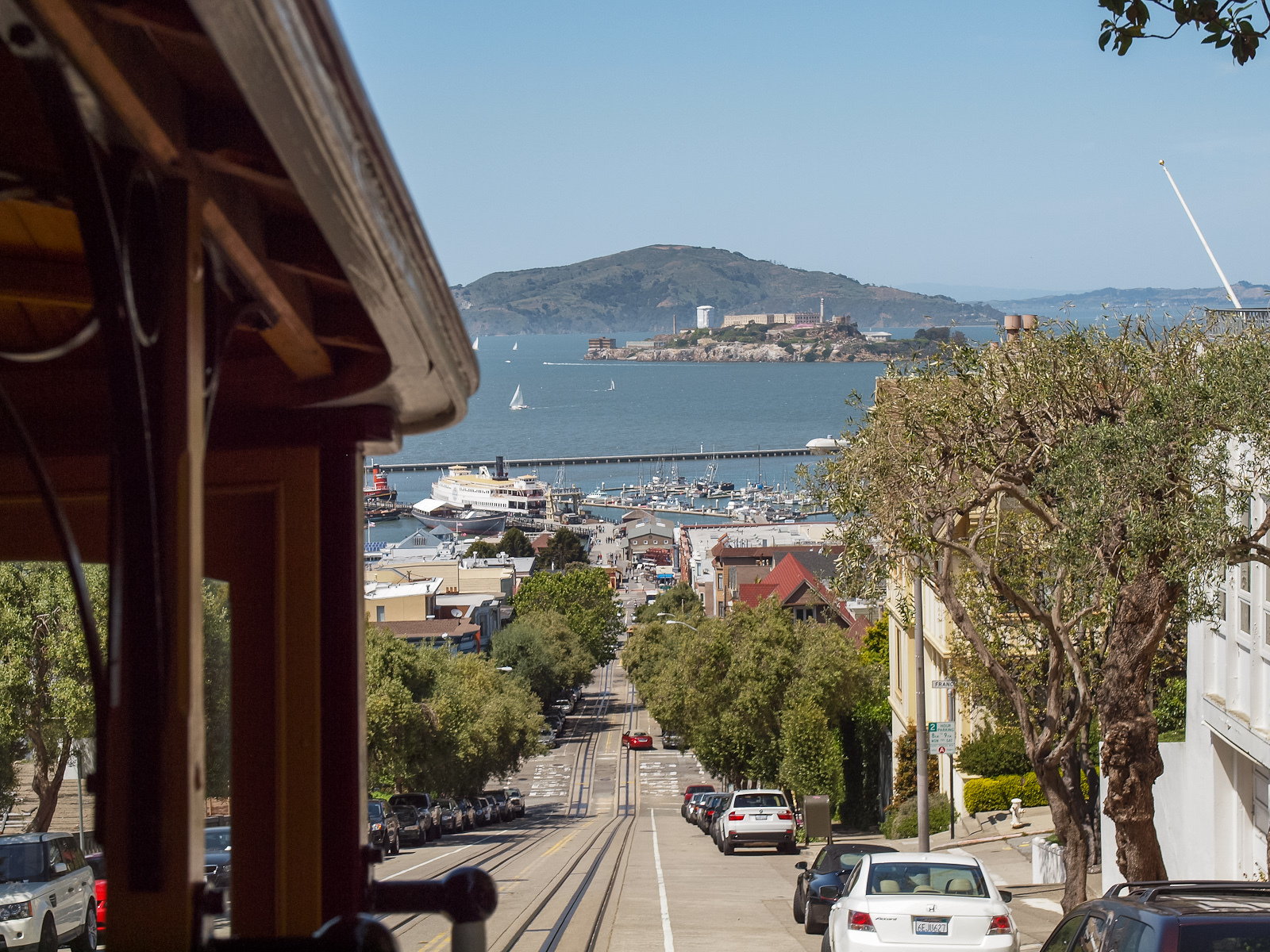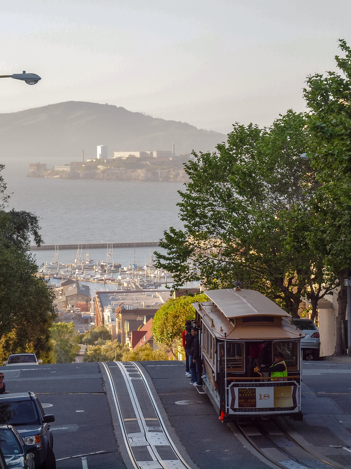 Je ne sais pas si on peut dire que j’ai vraiment visité San Francisco mais plutôt que j’y ai pas mal trainé. Un burrito / bière dans un parc le premier soir; la soirée qui se termine chez un gars dans le centre; plein de tours en cable-car les cheveux au vent (j’adore!); la vue sur le Golden Gate; le Fisherman’s Wharf, les otaries et les touristes; l’île d’Alcatraz; l’ex- quartier hippie de Haight-Ashbury et le Golden Gate Park; un vieux gay qui s’assied sur mon banc, me propose un joint et qui veut savoir si je suis le genre de mec qui batifole avec d’autres mecs; Chinatown et ses petits restos; le fameux fog qui roule dans la baie avec la corne de brume…