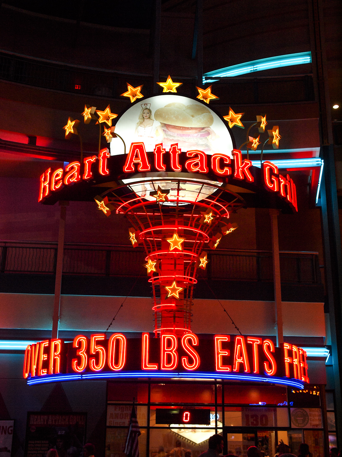 En fait le Nevada c’est un peu l’État où on a le droit de faire tout ce qui est interdit ailleurs, ou presque. Et Las Vegas est l’apothéose de ça, donc tout est demésurément exagéré. Tout est immense, les clims soufflent froid sur le trottoir alors qu’il fait 40° dehors, et il y a même un restaurant à thème malbouffe: “The Heartattack Grill” (le grill de la crise cardiaque). Les clients qui pèsent plus de 160 kilos mangent gratuitement. Au menu: Bypass Burger, Double Bypass Burger, Triple Bypass Burger, etc etc (en français: pontage, double pontage, triple pontage…). La classe, quand même.