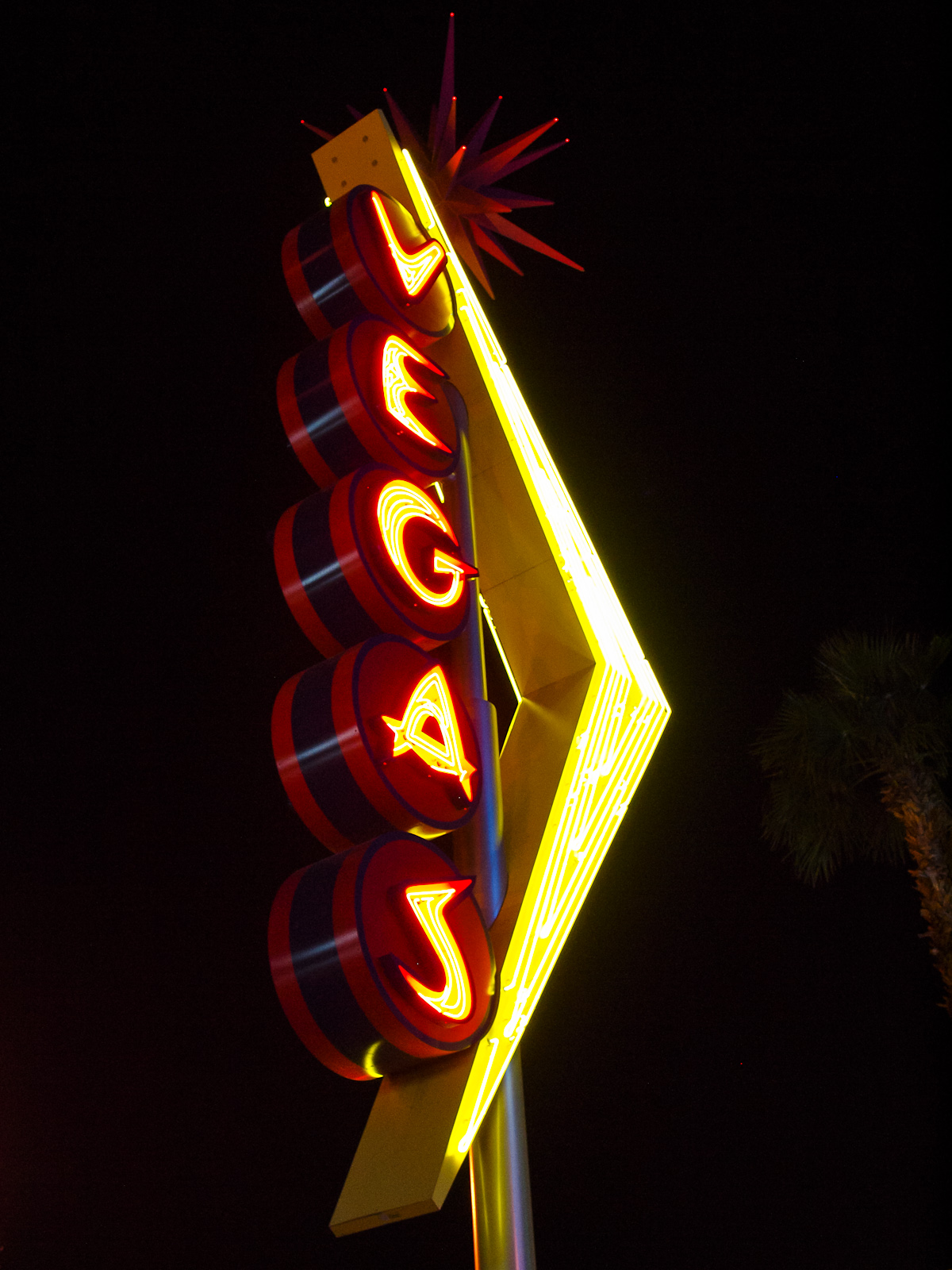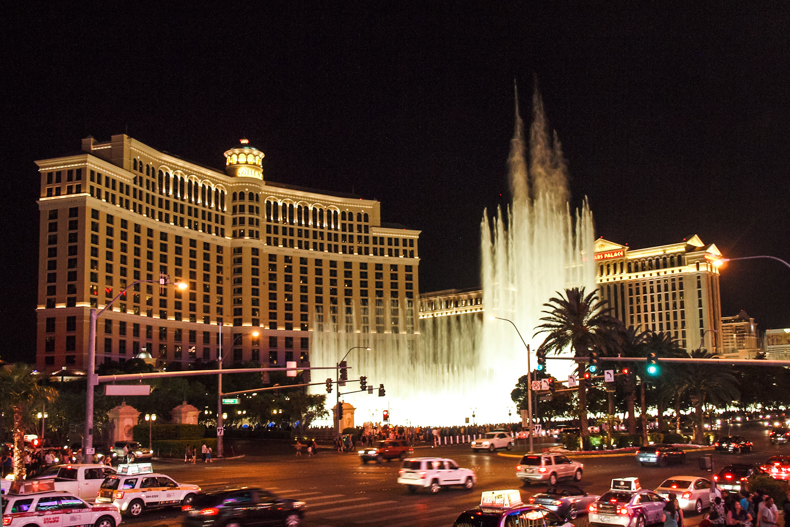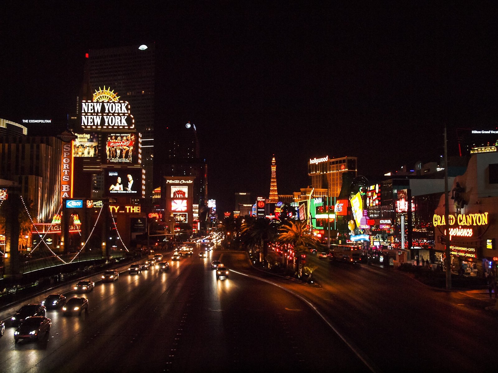 Je continue vers Vegas - je suis dans le désert et il fait nuit noire. Mais je vois une grosse tache orange dans le ciel au loin, qui se rapproche… jusqu’à ce que la ville se dévoile au détour d’un virage. Il y a de la lumière partout et on devine même les silhouettes des casinos sur le Strip. Sacré contraste avec la Vallée de la Mort :)