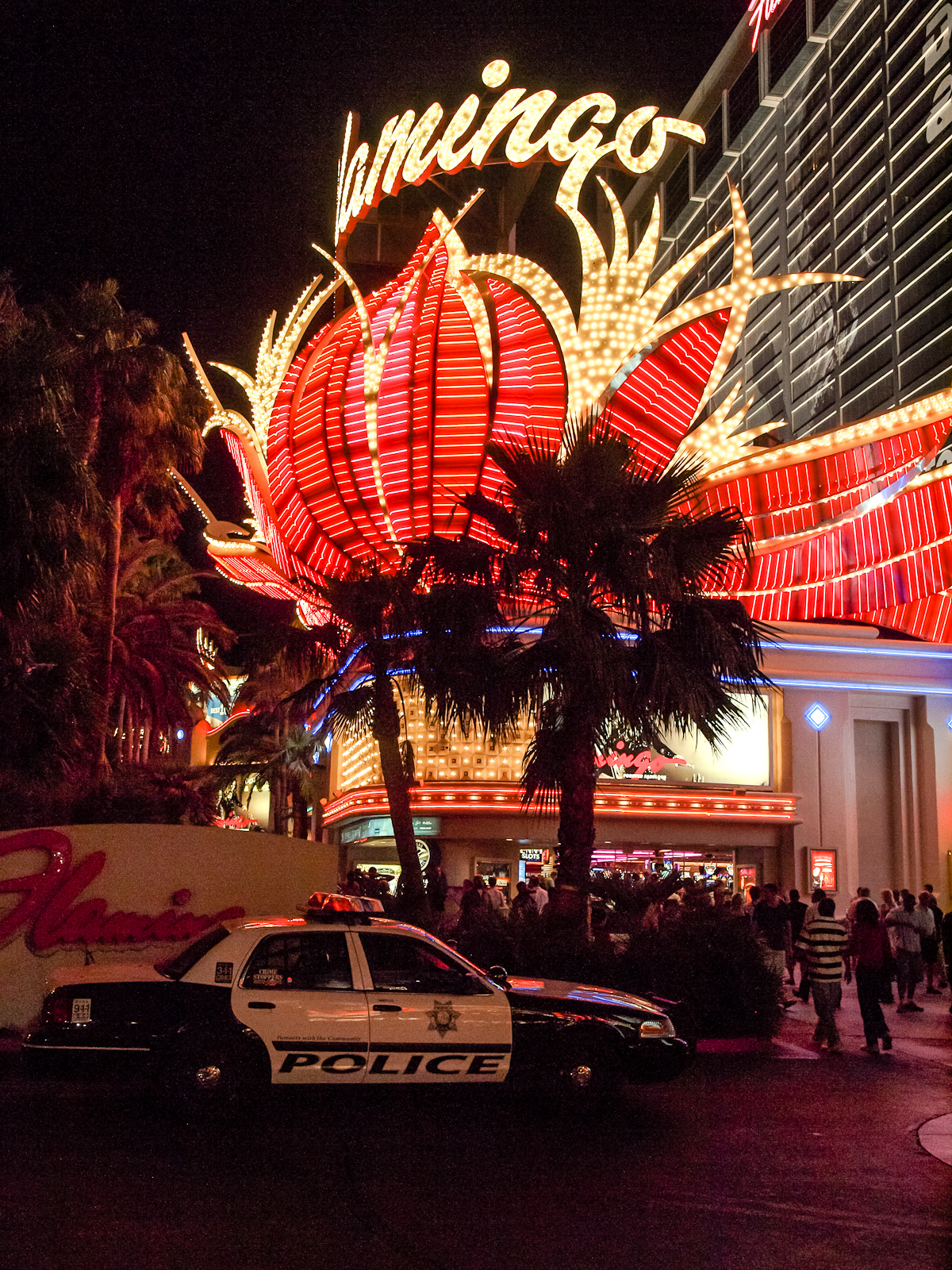 De là je suis parti me perdre dans Las Vegas. L’avantage c’est que même la nuit il se passe toujours quelque chose donc c’est pas grave qu’il soit déjà bien tard… Dans mon casino (tous les hôtels font casino et vice-versa en fait) il y a des spectacles de cirque, une fête foraine et même des manèges. Et bien sûr les machines à sous, la roulette, le poker, le craps, le blackjack, j’en passe et des meilleures. Et finalement c’est toujours un peu la même chose partout, sauf que le thème change: empire romain, Venise, Paris, New York, tropical… Enfin voilà. C’est rigolo à voir et l’ambiance y est très spéciale vu que tout le monde ou presque est là pour se détendre / jouer / s’amuser. C’est comme une ville de vacances mais sans plage, monuments ou nature. Juste du divertissement, de l’alcool et des filles faciles (la prostitution est légale ici).