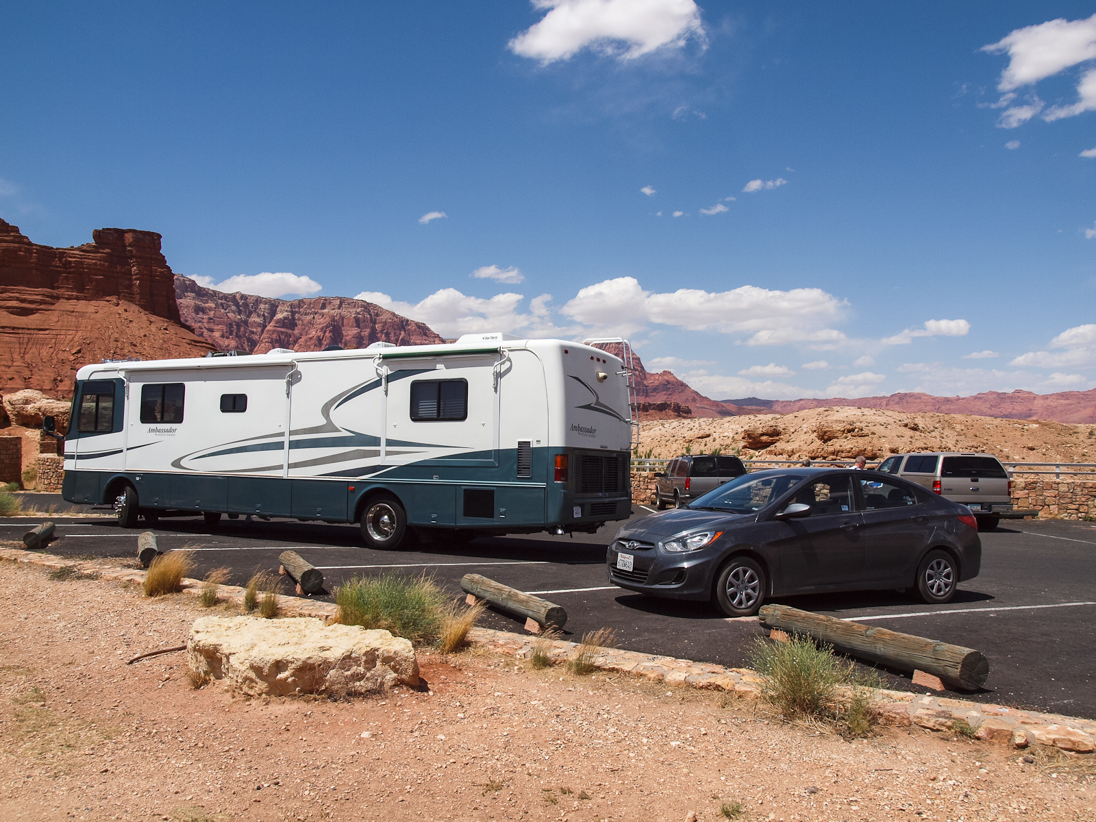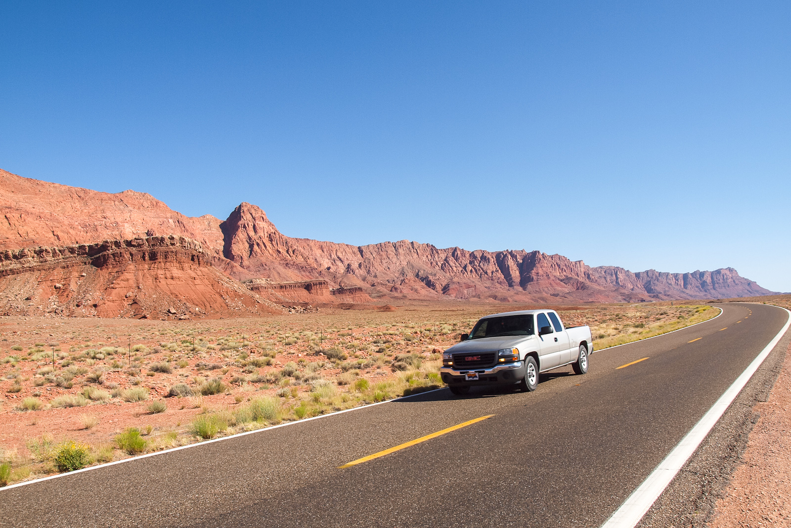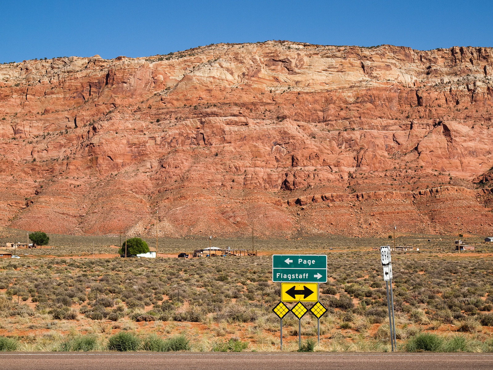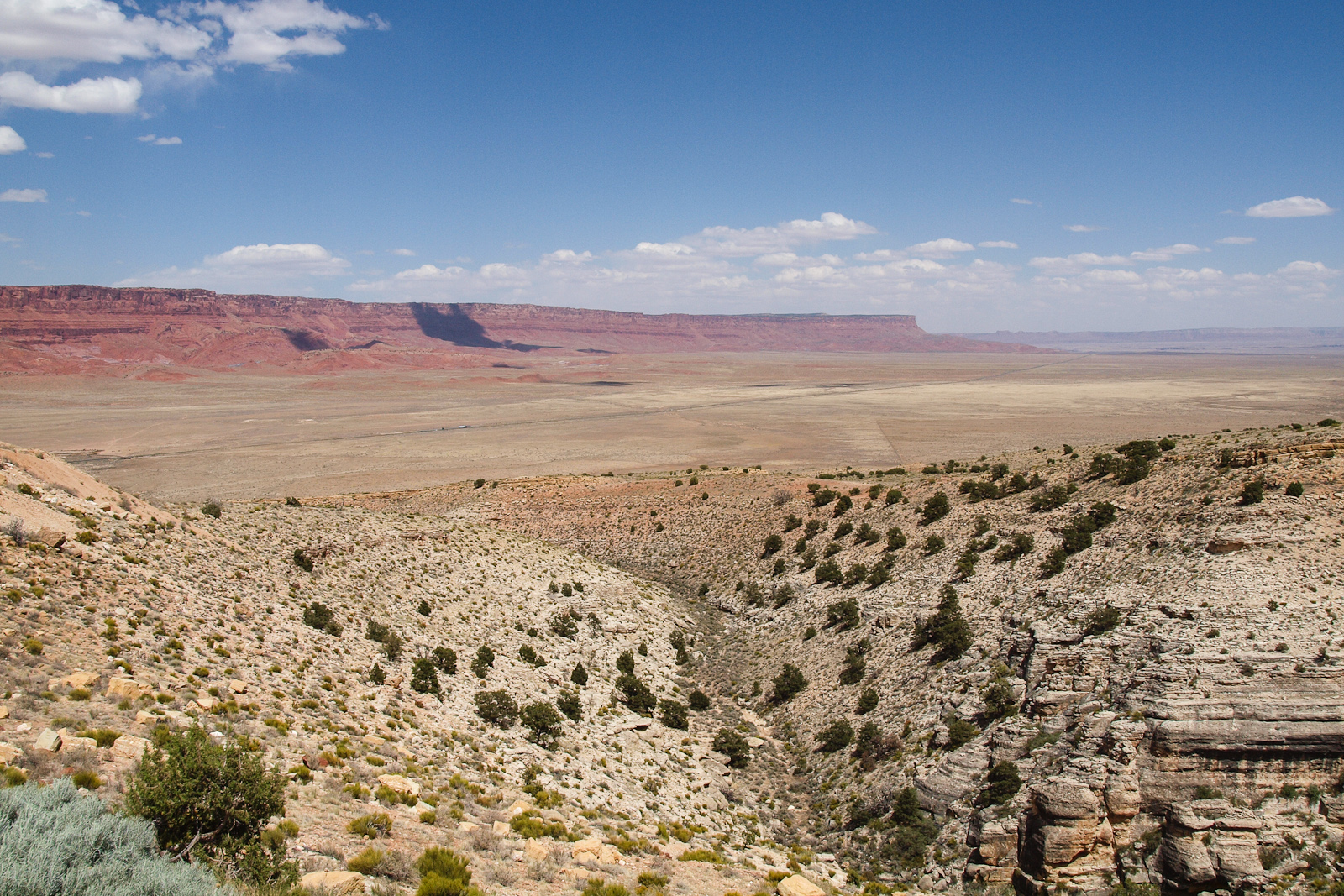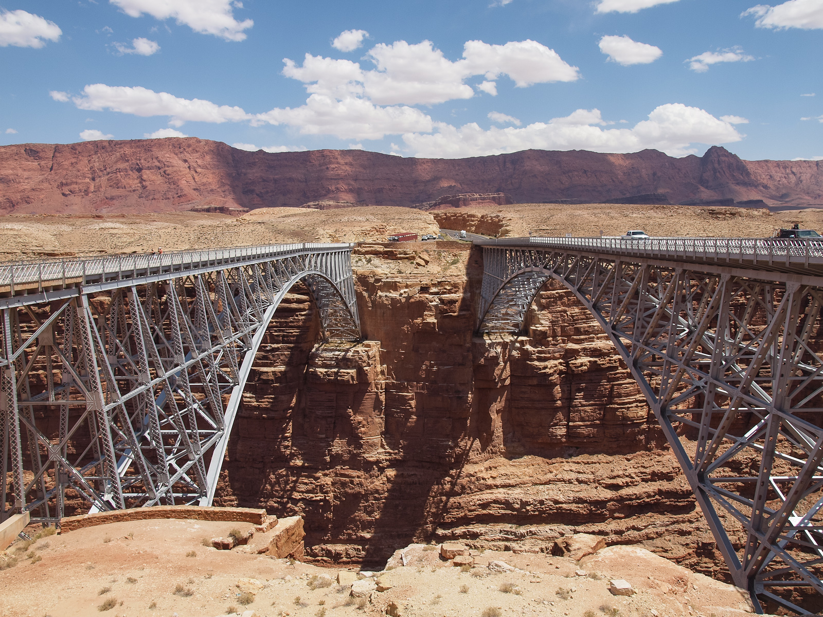 Donc juste à la sortie de Page, on traverse le Colorado et le machin est déjà foutrement impressionnant. Si c’est comme ça maintenant qu’est ce que ça va être au Grand Canyon (oui parce que en fait au fond du Grand Canyon coule le Colorado, merci de revoir votre géographie). C’est profond, et large. Et on le traverse sur un pont au style délicieusement rétro, où l’on apprend au passage que le fleuve a toujours été une barrière naturelle tant pour les Indiens que pour les colons. Tu m’étonnes.