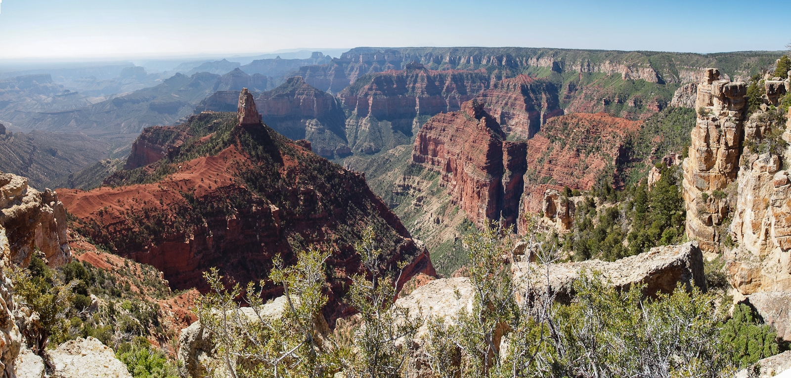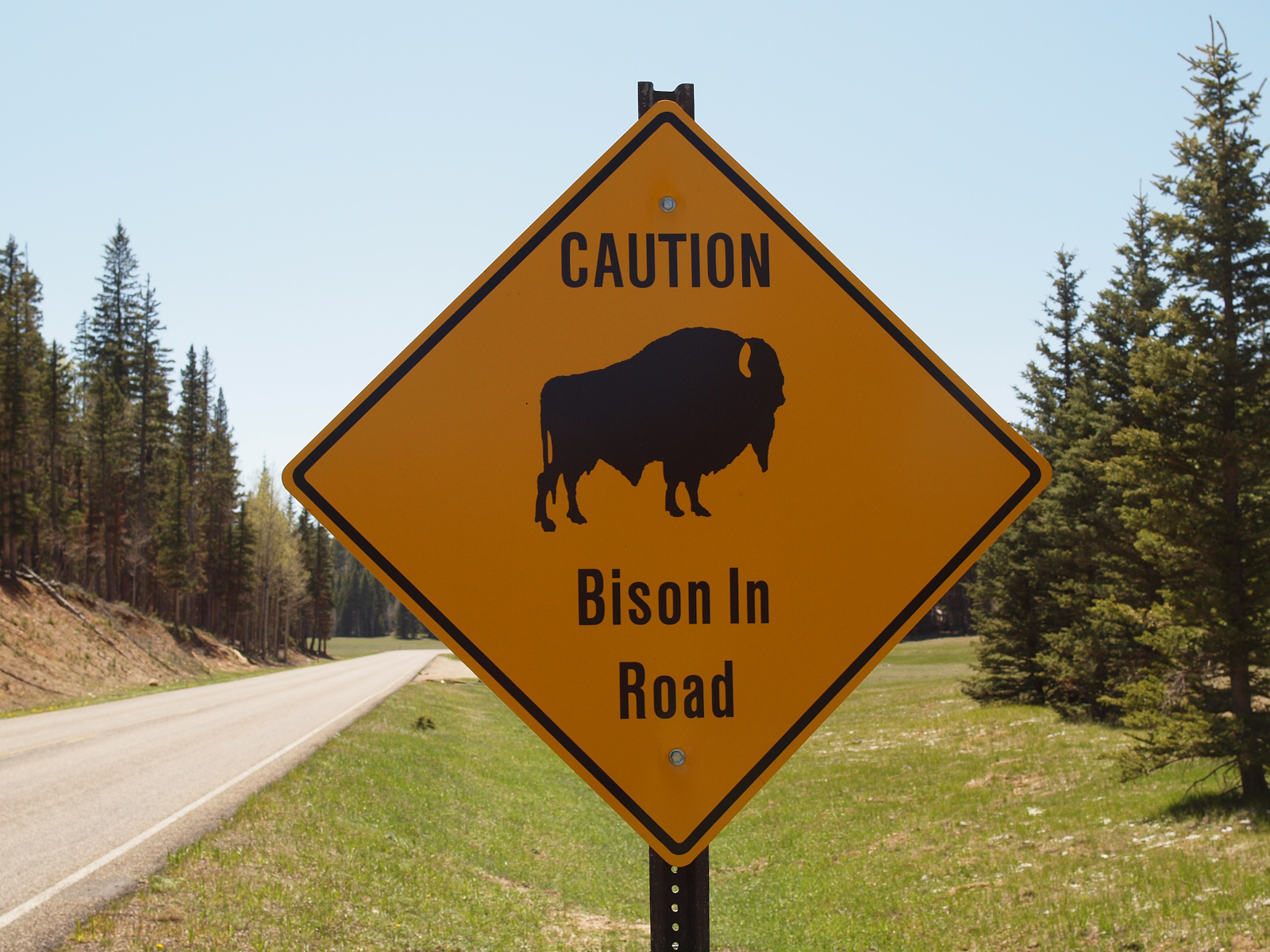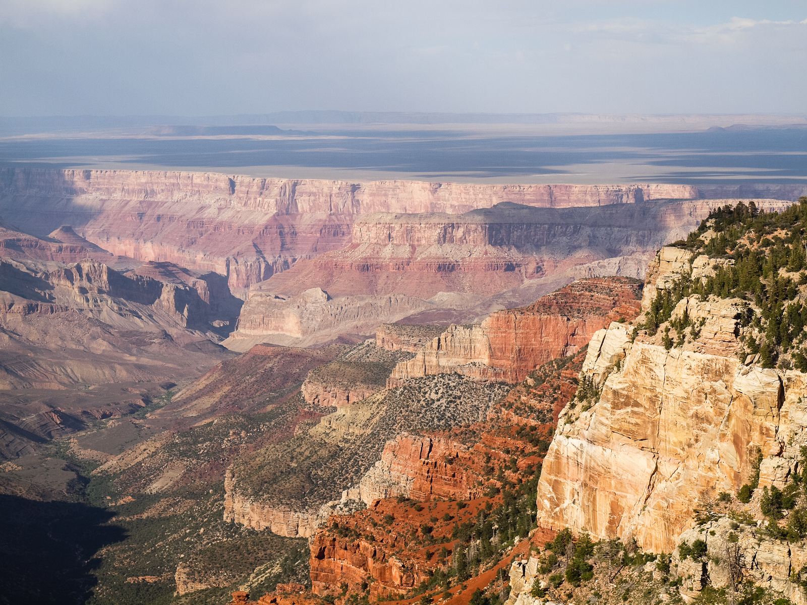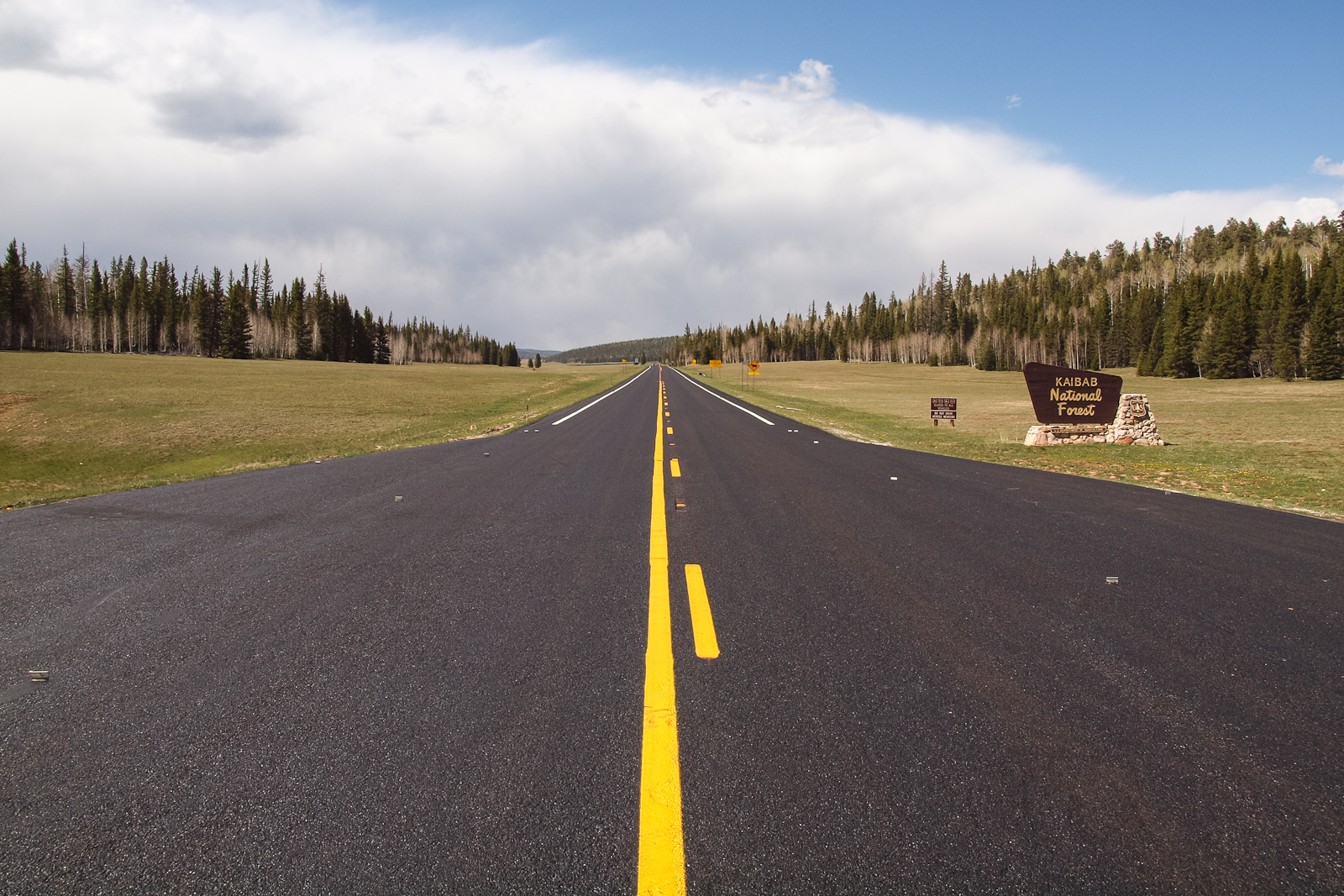 Ensuite je passe à côté des Vermillion Cliffs (des falaises orange, donc, le pragmatisme américain fait des merveilles au niveau des noms). C’est joli aussi. Et je continue à monter - le North Rim est à près de 3000m d’altitude. Donc on passe du niveau de la mer avec un désert aride, des serpents et des cailloux partout à un truc très montagneux, avec des pins, des cerfs et des grandes plaines trempées d’eau. La diversité naturelle dans toute sa splendeur…
