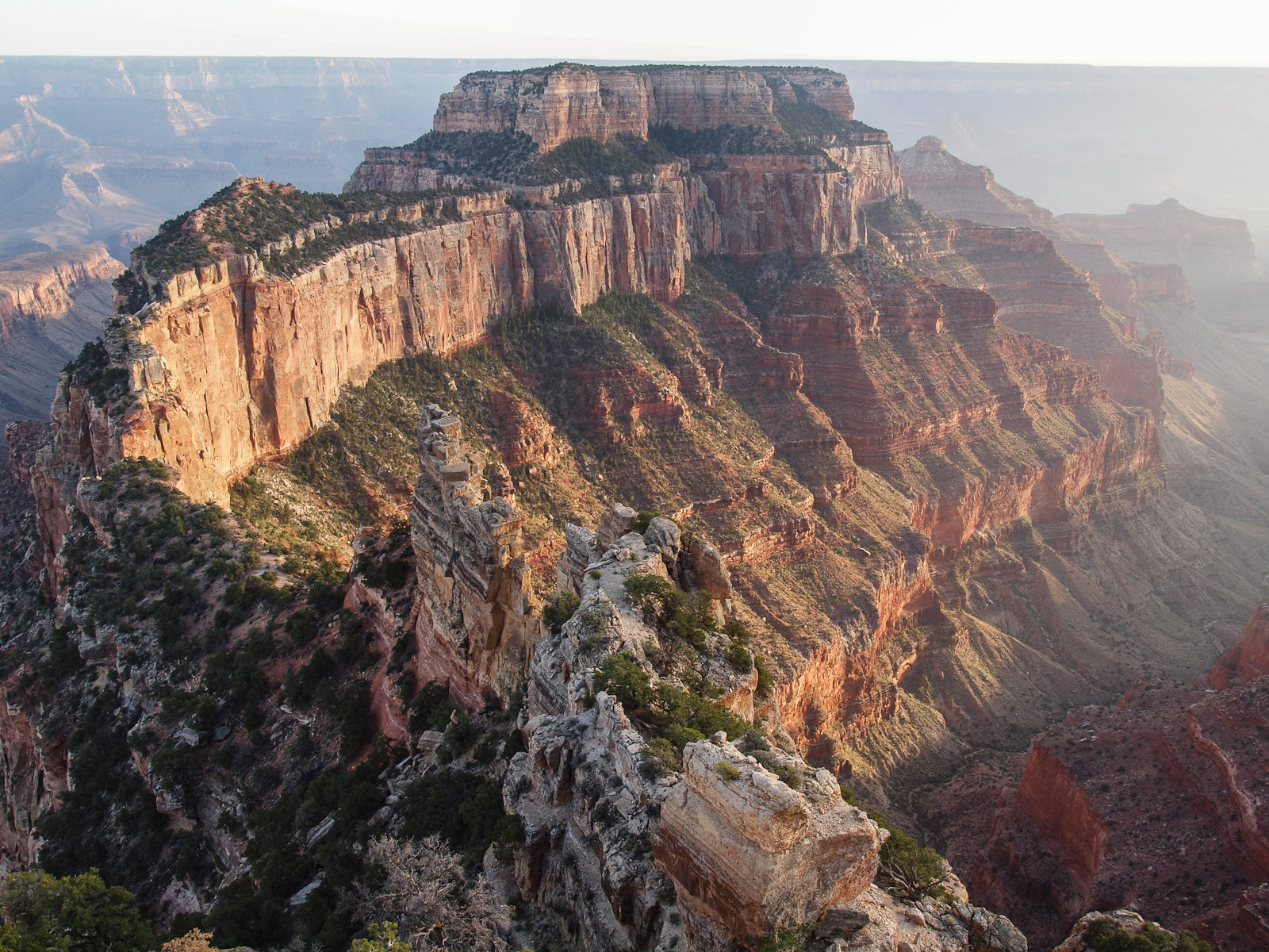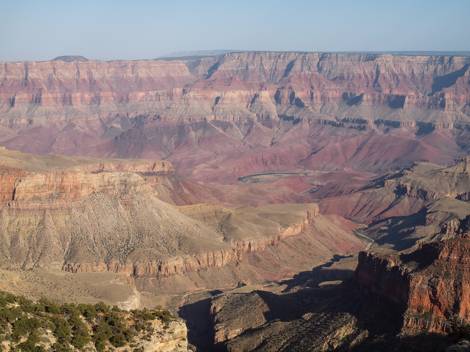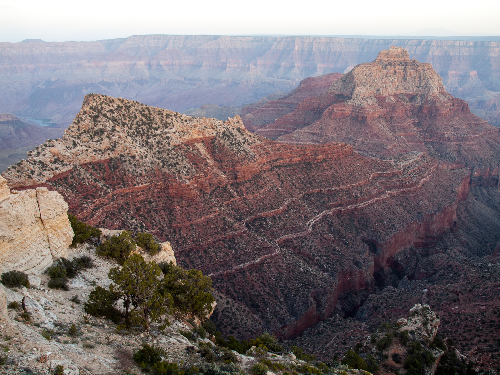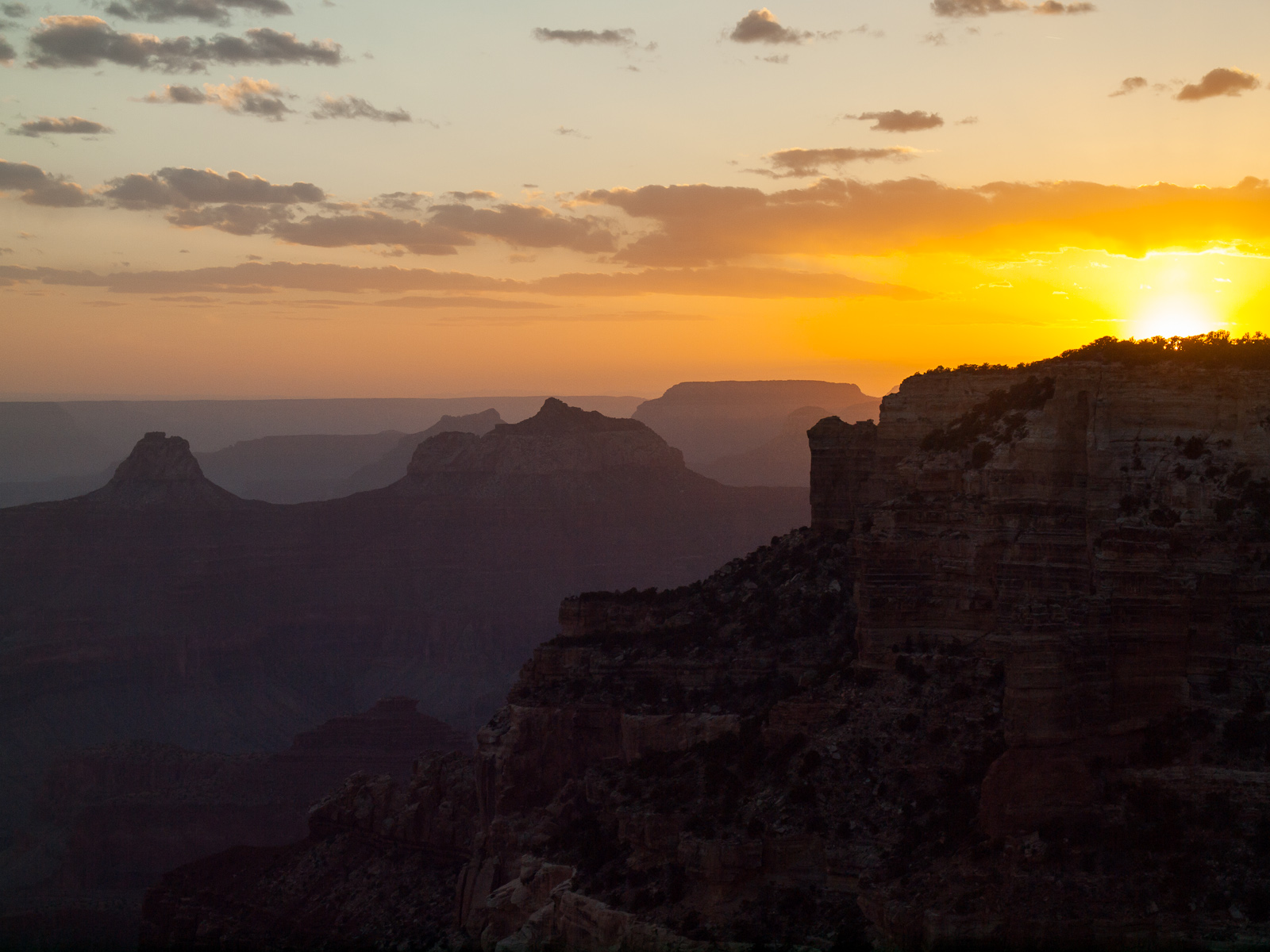 J’arrive finalement à destination, et je me renseigne à la cabine des rangers du parc. Le Grand Canyon est fourbe pour les randonneurs, puisque c’est très facile de descendre dedans mais c’est beaucoup plus dur de remonter (vu que ça monte, forcément, et que c’est de plus en plus en altitude, et qu’il y a pas d’eau non plus). Comme mon assurance rapatriation machin arrive à expiration ce jour même autant y aller tranquillement… Donc je me contente de prendre des photos gentiment, et de monter encore pour rejoindre un autre view point pour le coucher de soleil. C’est beau mais je suis un peu déçu - déjà je pensais voir un truc vraiment impressionnant et en fait, ça reste un canyon. Et en fait c’est tellement large qu’on se rend pas trop compte de la taille. Et comme il y a des feux de forêt dans le sud de l’État, l’air est trouble et ça rend pas top. Enfin bon, on fait avec ce qu’on a.