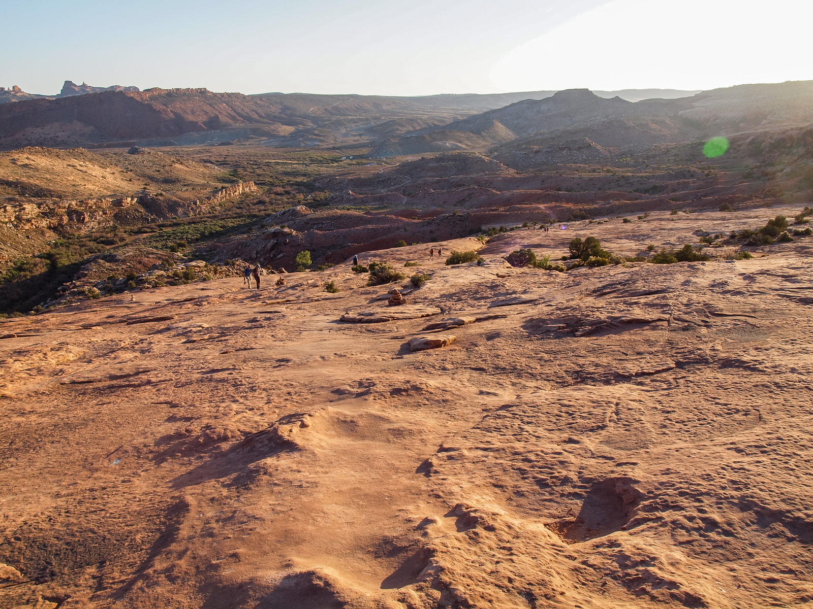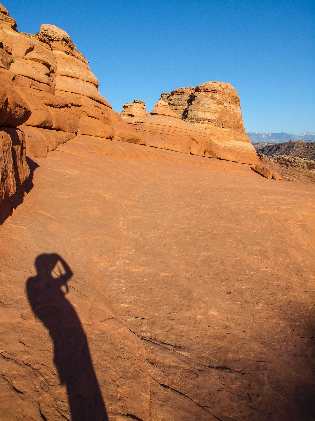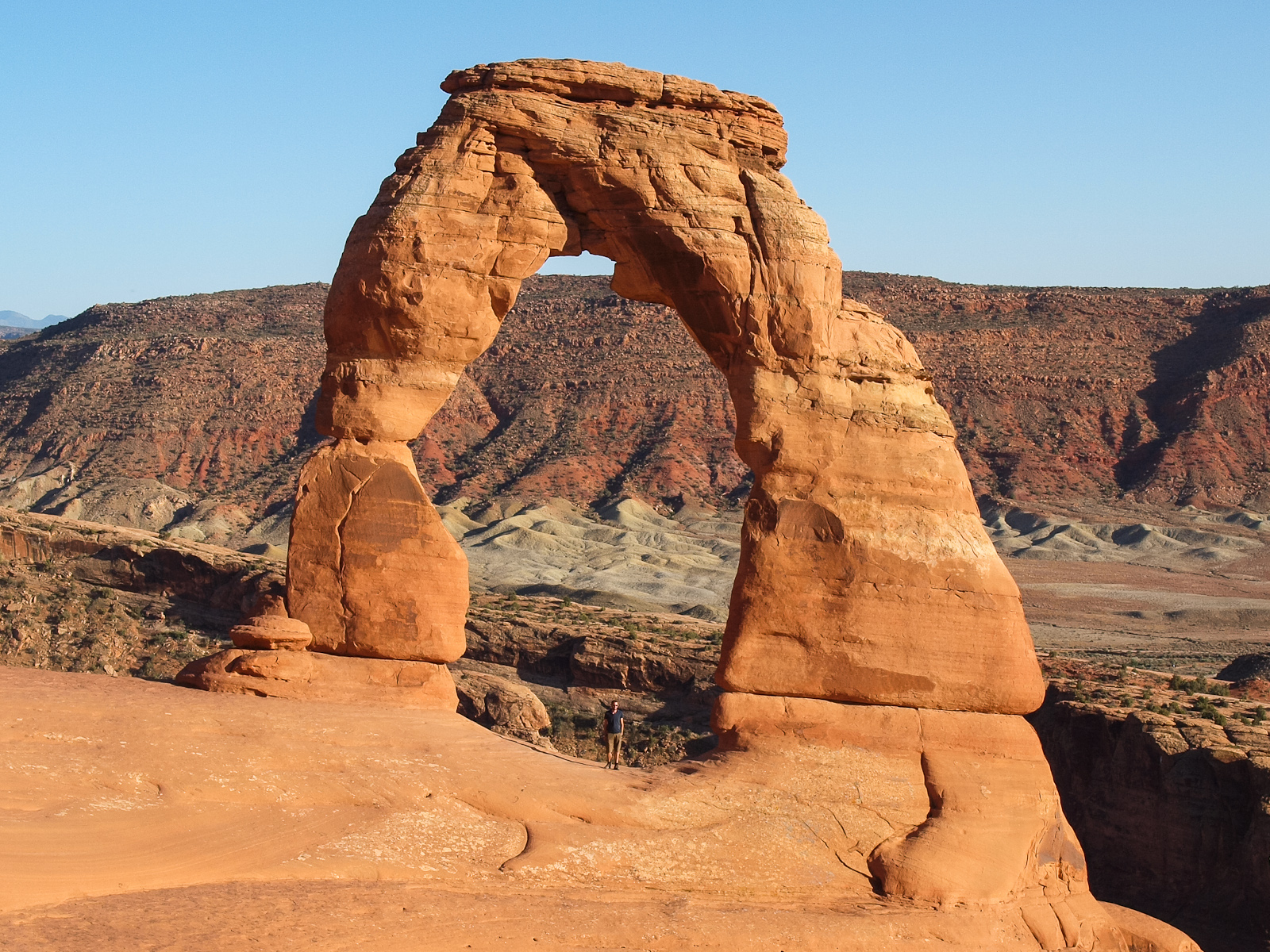 Je me fends même d’une petite randonnée pour aller admirer le clou du parc, la fameuse “Delicate Arch”. Ça monte pendant une petite heure, en plein soleil, sur de la roche lisse… pour arriver au point de vue où tout le monde semble s’être donné rendez-vous pour regarder le coucher de soleil. Je me fais tirer le portrait par une touriste allemande à qui j’avais rendu le même service, et je me trouve un petit coin à l’écart où on voit la même chose mais sans les hordes de touristes et le bruit qui va avec. C’est beau…