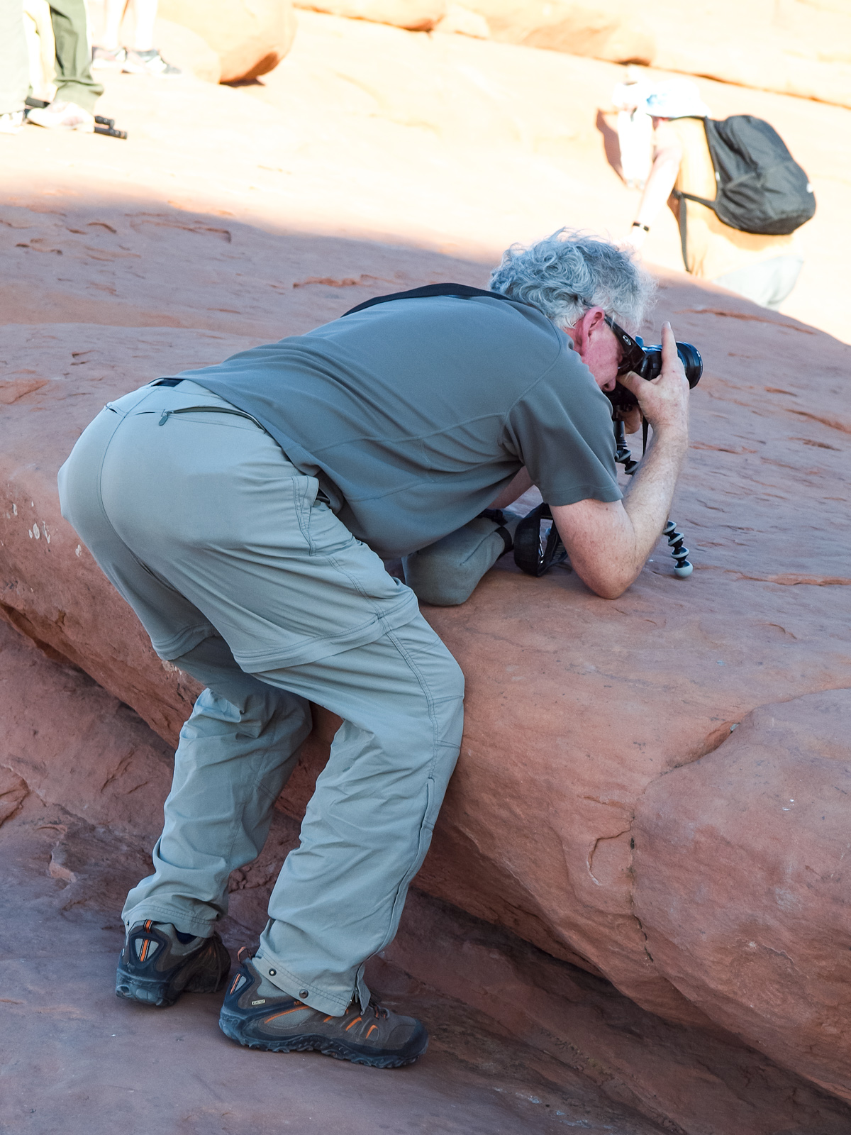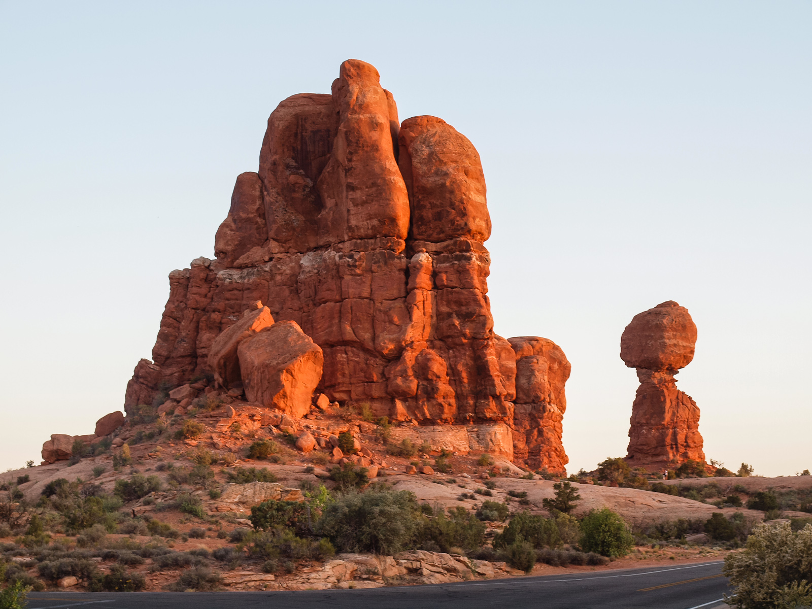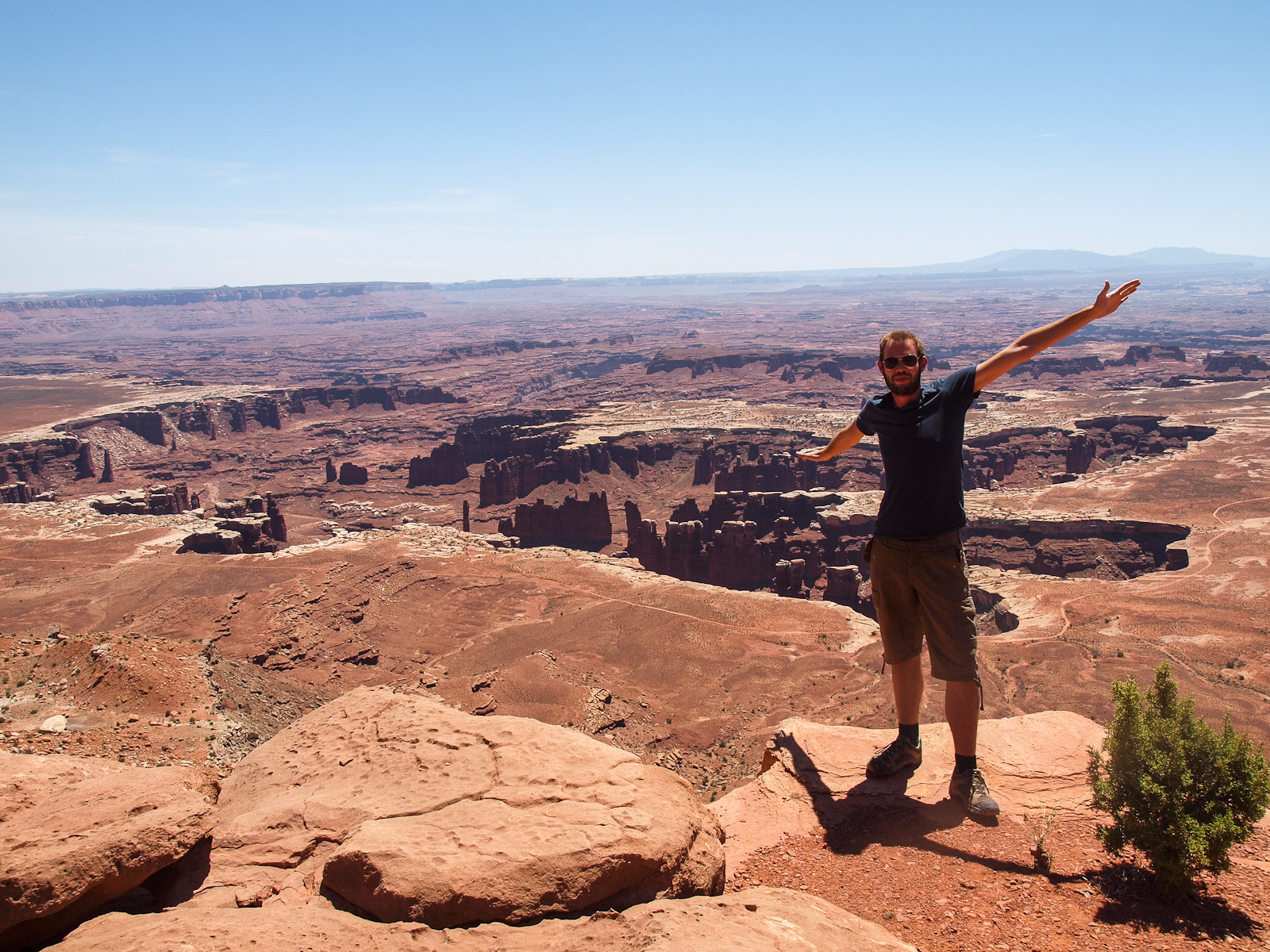 Je me fends même d’une petite randonnée pour aller admirer le clou du parc, la fameuse “Delicate Arch”. Ça monte pendant une petite heure, en plein soleil, sur de la roche lisse… pour arriver au point de vue où tout le monde semble s’être donné rendez-vous pour regarder le coucher de soleil. Je me fais tirer le portrait par une touriste allemande à qui j’avais rendu le même service, et je me trouve un petit coin à l’écart où on voit la même chose mais sans les hordes de touristes et le bruit qui va avec. C’est beau…