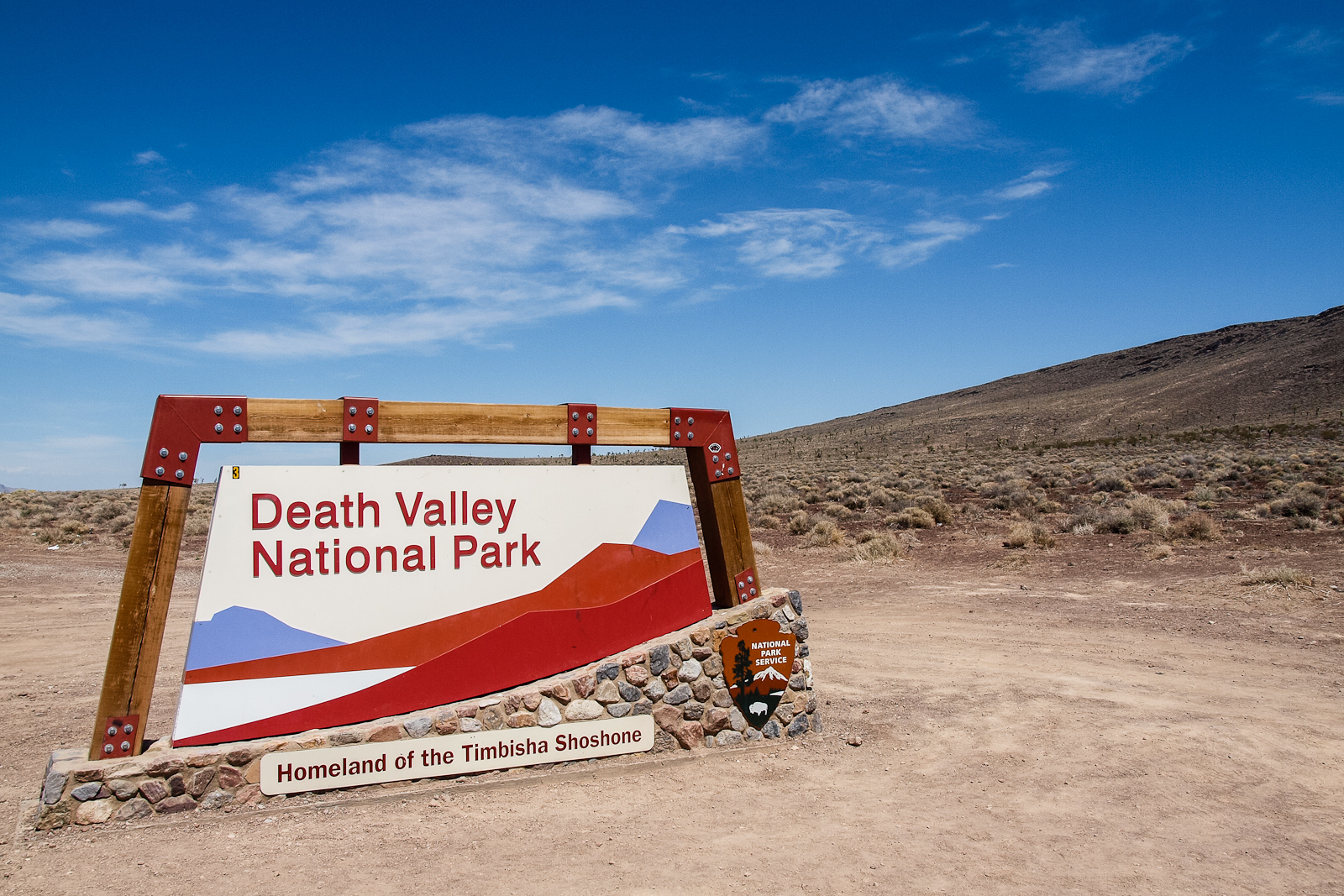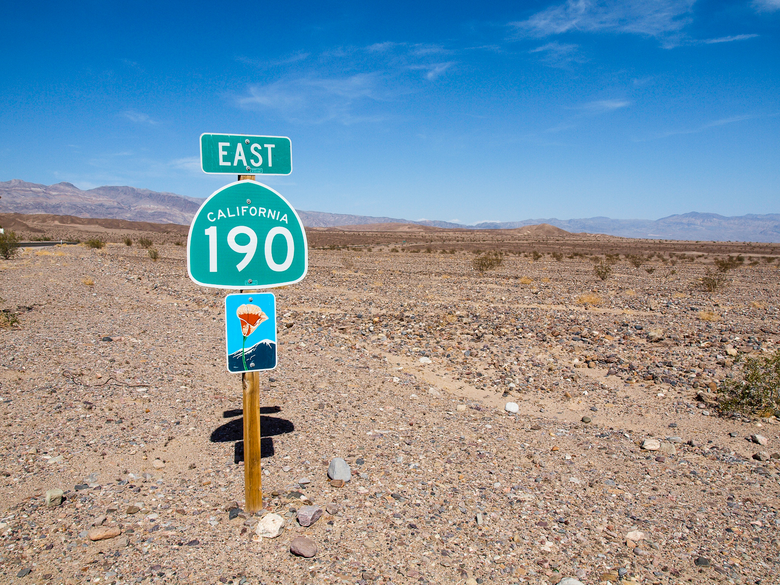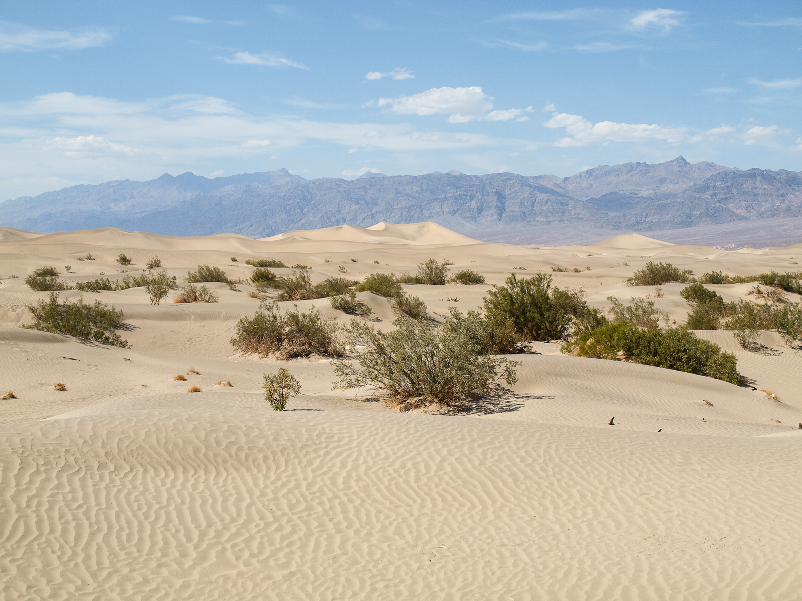 Je laisse les montagnes et leur neige derrière moi, et j’entame la longue descente vers… la Vallée de la Mort, rien que ça. À la pause pique-nique je dois déjà me réfugier à l’ombre, mais lorsque j’arrive dans le parc proprement dit, on est l’après-midi et c’est carrément un four… il y a même des dunes de sable, au cas où on serait pas sûr que c’est le désert.