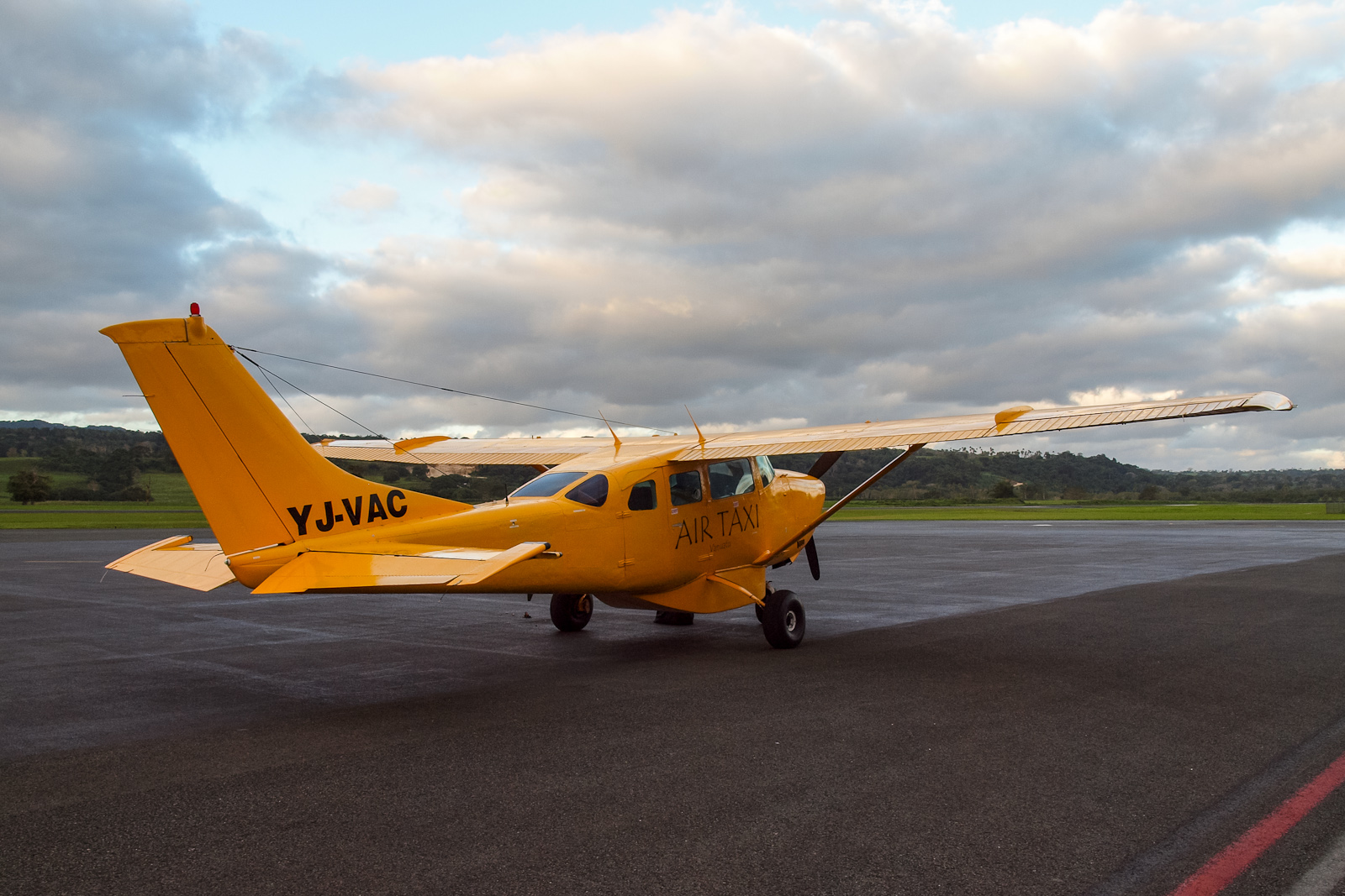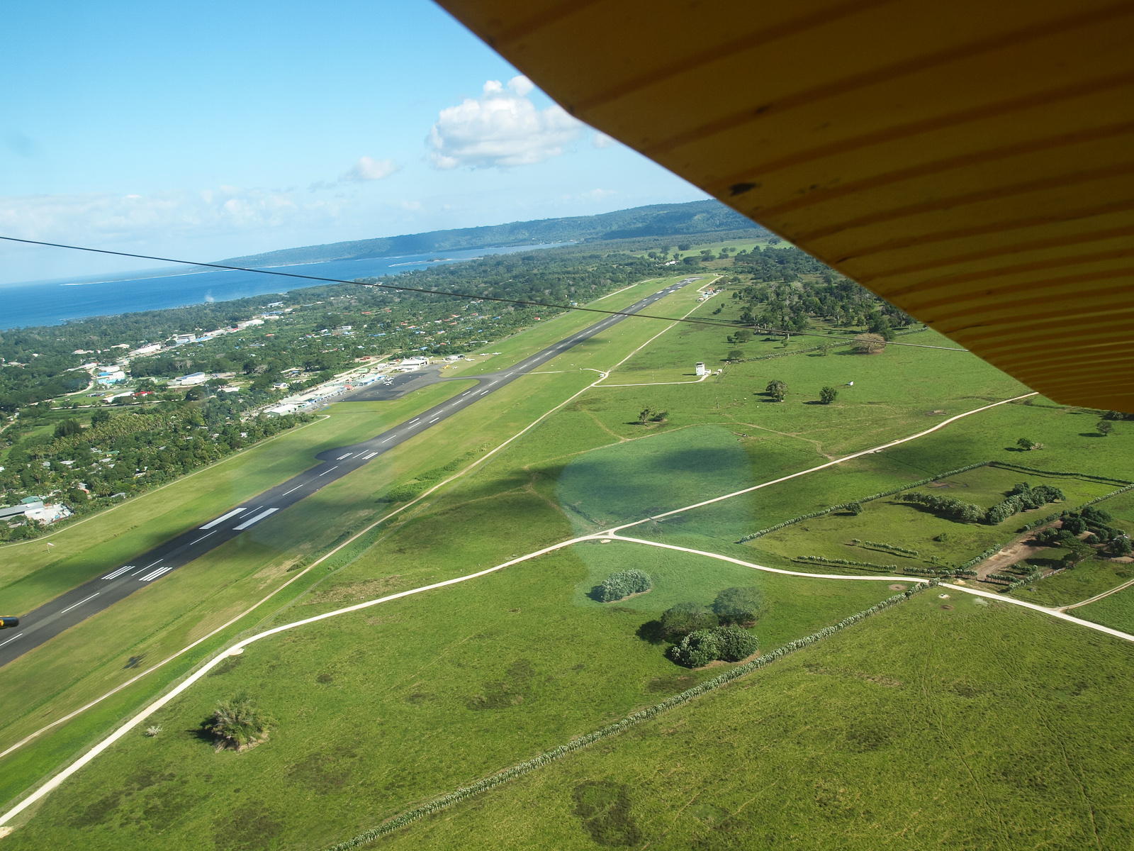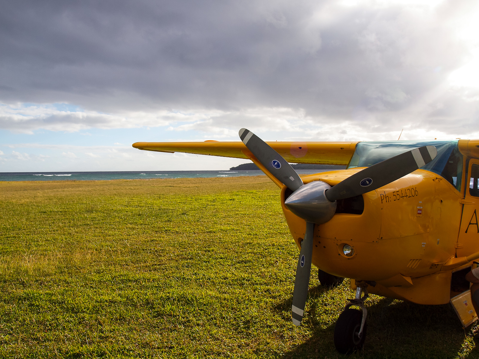 En ce qui nous concerne, on a attendu d’avoir de bonnes prévisions météo, on a réservé un avion privé (c’est pas la classe?) et on s’est envolés, direction Pentecôte. Après une grosse heure de vol à survoler le Pacifique et ses atolls coralliens, on atterrit à l’aéroport de Lonorore. Pas la peine de chercher le comptoir d’enregistrement et la salle d’embarquement, c’est pas trop l’esprit