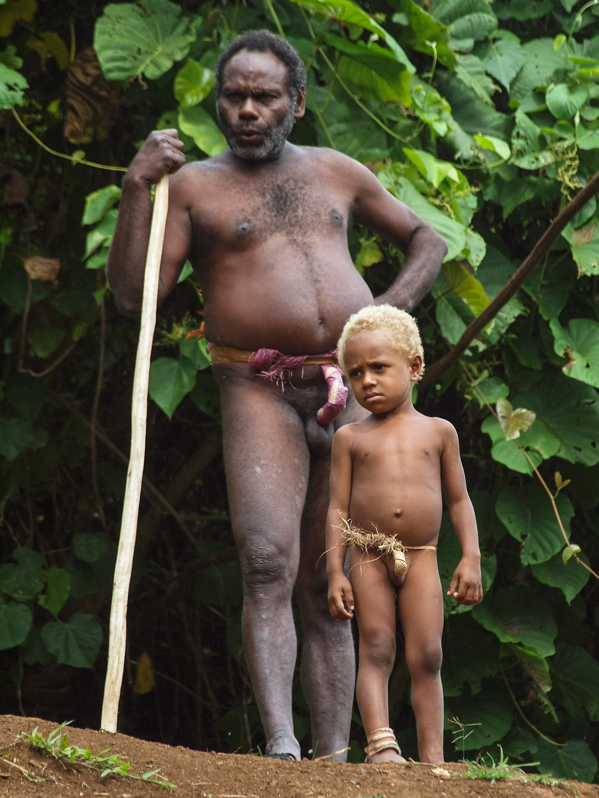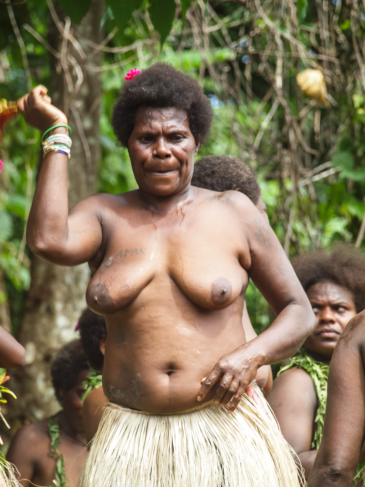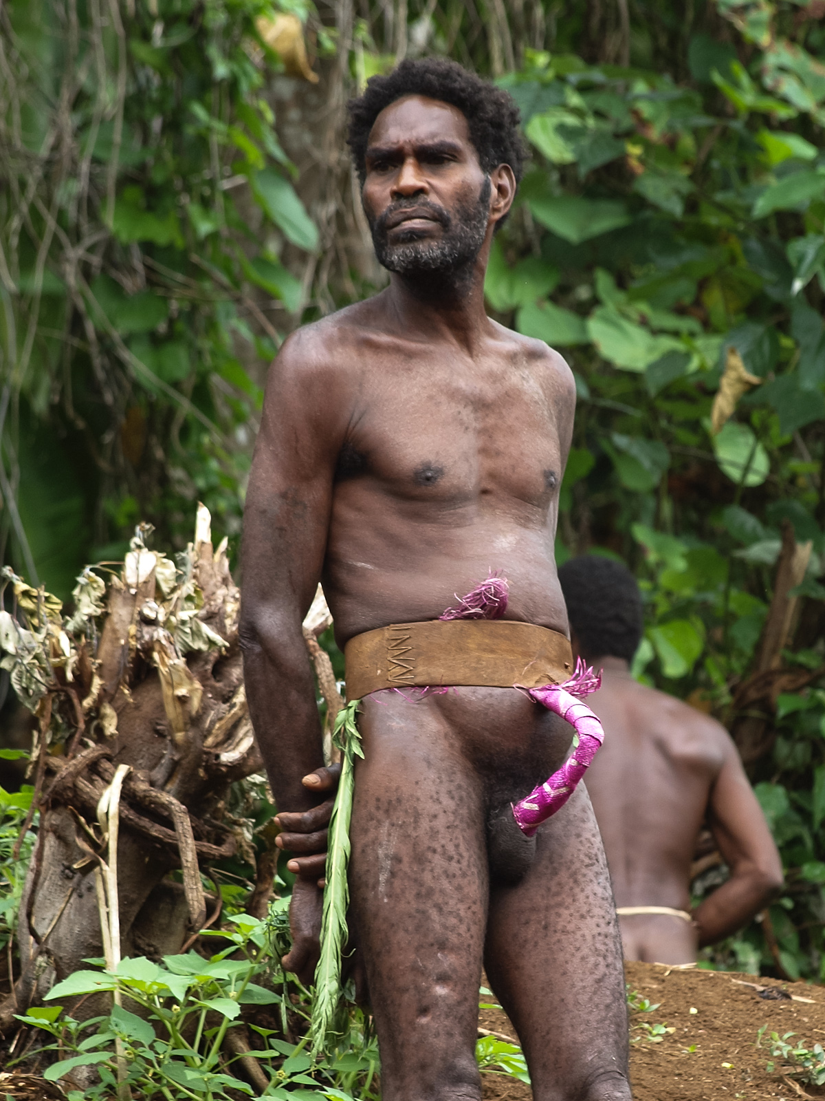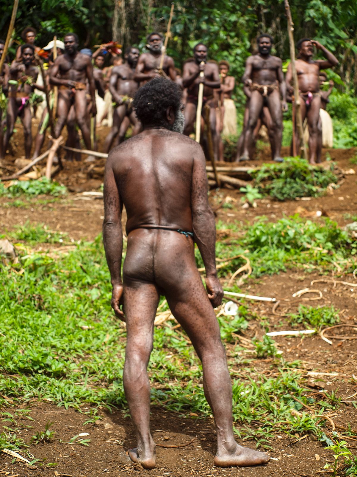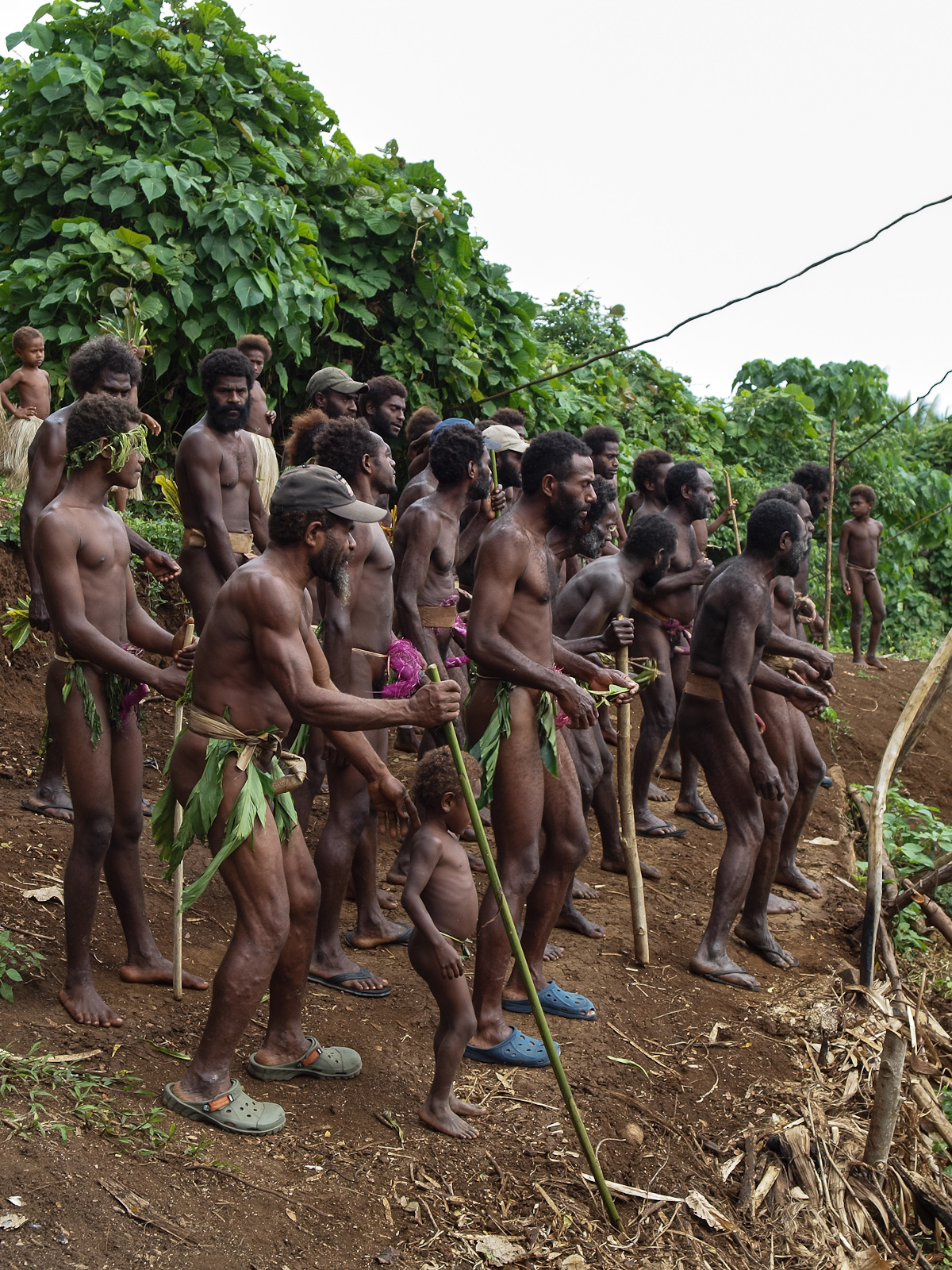 Quelques centaines de mètres plus loin, on arrive sur le site du saut proprement dit. J’avais un peu peur de me retrouver dans un Disneyland pour touristes - et même si le truc n’a pas l’air 100% authentique c’est beaucoup mieux que ce que j’avais imaginé! La tour en bois est installée dans la pente, les spectateurs sont au premier rang, les danseurs au fond, et le chef de la tribu supervise les opérations - vêtu de son seul namba , l’étui pénien traditionnel.