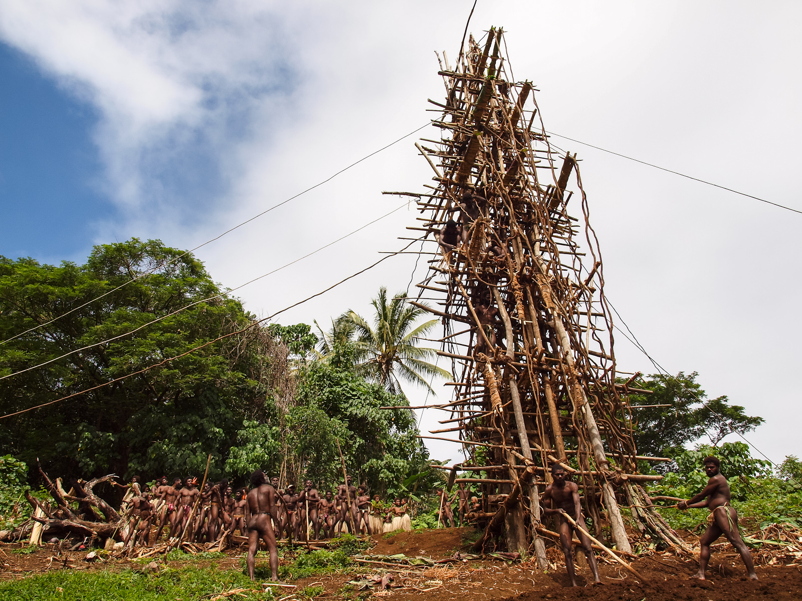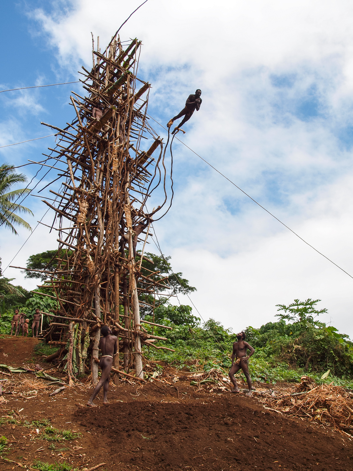 La tradition remonterait à très longtemps - une femme, fatiguée de son mari, se serait enfuie dans la jungle pour lui échapper. Alors qu’il courait à sa poursuite, elle serait montée dans un banyan, se serait attaché des lianes au pied et aurait sauté dans le vide. Le brave homme, dans sa précipitation, se serait lui élancé sans prendre le soin de s’attacher des lianes, et se serait écrasé en bas de l’arbre. Et n’aurait bien sûr pas survécu… Depuis, les hommes de l’île, bien décidés à ne pas se faire avoir une nouvelle fois, se livrent à ce périlleux exercice qui leur sert aussi de rite de passage à l’âge adulte. Et comme ça se passe à la saison des ignames, un joli saut leur garantit une récolte abondante - ce qui ne gâche rien.