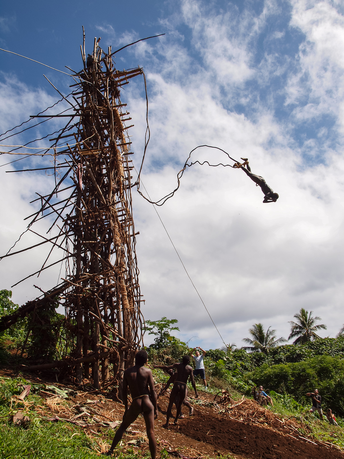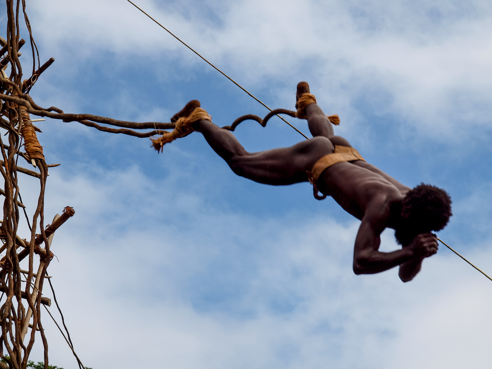 Certains disent que c’est cette tradition qui aurait inspiré le bungee jumping - en tout cas la position me paraît différente: ici il faut faire attention à bien se propulser vers l’avant en essayant de garder le corps à l’horizontale. Et la chute s’arrête lorsque le corps rentre en contact avec le sol, que ce soit brutalement ou non. Les sauteurs ont la responsabilité de leur “matériel” - ils récupèrent et tressent les lianes, et sont eux-mêmes responsables de la longueur et de l’élasticité de leur “élastique”.