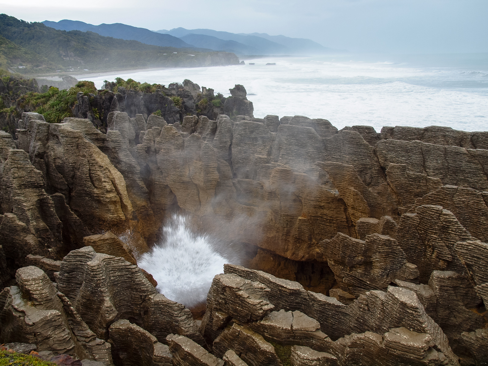 Arrivé à Hokitika, la pluie s’est invitée à faire un bout de chemin avec moi - temps idéal pour apprécier les “Pancake Rocks” de Punakaiki.